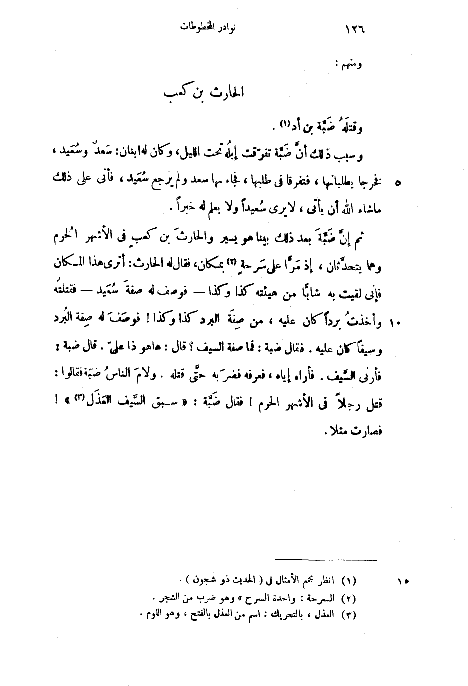 ثم إن ضبة بعد ذلك بينا هو يسير والحارث بن كعب في الأشهر الحرم وهما يتحدثا، إذ مر على سرحة بمكان، فقال هل الحارث: أترى هذا المكان فإني لقيت به شاباً من هيئته كذا وكذا فوصف له صفة سعيد فقتلته وأخذت برداً كان عليه، من صفة البرد كذا وكذا! فوصف له صفة البرد وسيفاً كان عليه. فقال ضبة: فما صفة السيف؟ قال: هاهو ذا علي. قال ضبة: فأرني السيف. فأراه إياه، فعرفه فضربه حتى قتله. ولام الناس ضبة فقالوا قتل رجلاً في الأشهر الحرم! فقال ضبة: "سبق السَّيف العذل"! فصارت مثلا.