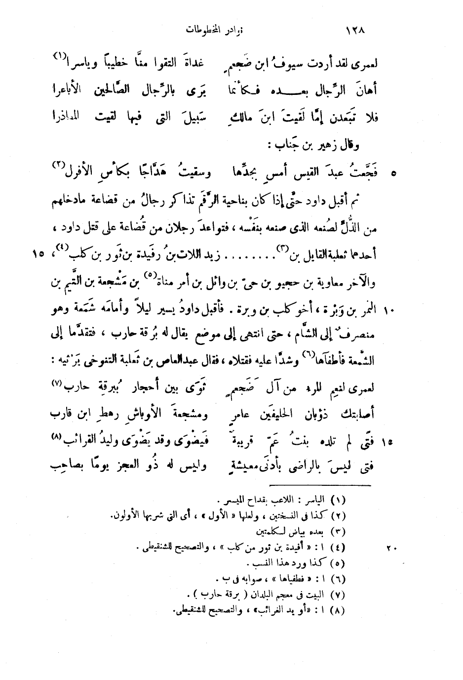 ثم أقبل داود حتى إذا كان بناحية الرقم تذاكر رجال من قضاعة ما دخلهم من الذل لصنعه الذي صنعه بنفسه، فتواعد رجلان من قضاعة على قتل داود، أحدهما ثعلبة القايل بن......... زيد اللات بن رفيدة بن ثور بن كلب، والآخر معاوية بن حجيو بن حي بن وائل بن أمر مناة بن مشجعة بن التيم بن النمر بن وبرة، أخو كلب بن وبرة. فأقبل داود يسير ليلاً وأمامه شمعة وهو منصرف إلى الشام، حتى انتهى إلى موضع يقال له برقة حارب، فتقدما إلى الشمعة فأطفآها وشدا عليه فقتلاه، فقال عبد العاص بن ثعلبة التنوخي يرثيه: