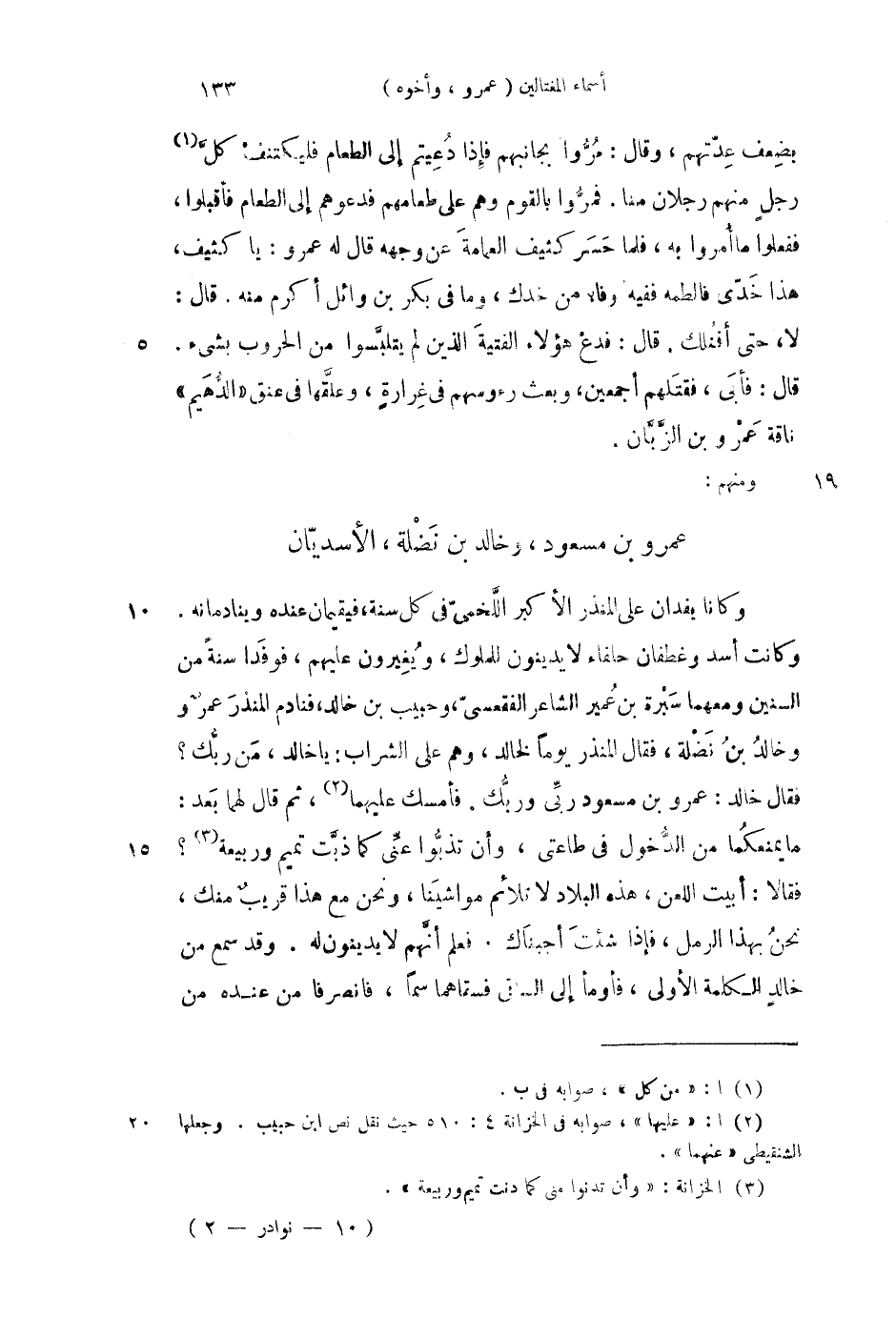 بضعف عدتهم، وقال: مروا بجانبهم فإذا دعيتم إلى الطعام فليكتنف كل رجل منهم رجلان منا. فمروا بالقوم وهم على طعامهم فدعوهم إلى الطعام فأقبلوا، ففعلوا ما أمروا به، فلما حسر كثيف العمامة عن وجهه قال له عمرو: يا كثيف، هذا خدي فالطمه ففيه وفاء من خدك، وما في بكر بن وائل أكرم منه. قال: لا، حتى أقتلك. قالا: فدع هؤلاء الفتية الذين لم يتلبسوا من الحروب بشيء. قال: فأبى، فقتلهم أجمعين، وبعث رءوسهم في غرارة، وعلقها في عنق "الدهيم" ناقة عمرو بن الزبان.