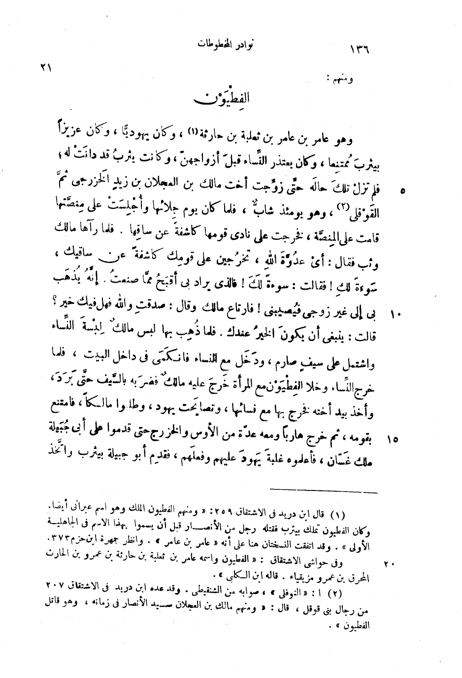 وهو عامر بن عامر بن ثعلبة بم حارثة، وكان يهودياً، وكان عزيزاً بيثرب ممتنعاً، وكان يعتذر النساء قبل أزواجهن، وكانت يثرب قد دانت له؛ فلم تزل تلك حاله حتى زوجت أخت مالك بن العجلان بن زيد الخزرجي ثم القوقلي، وهو يومئذ شاب، فلما كان يوم جلائها وأجلست على منصتها قامت على المنصة، فخرجت على نادي قومها كاشفة عن ساقها. فلما رآها مالك وثب فقال: أي عدوة الله، تخرجين على قومك كاشفة عن ساقيك، سوءة لك! فقالت: سوءة لك! فالذي يراد بي أقبح مما صنعت. إنه يذهب بي إلى غير زوجي فيصيبني! فارتاع مالك وقال: صدقت والله فهل فيك خير؟ قالت: ينبغي أن يكون الخير عندك. فلما ذهب بها لبس مالك لبسة النساء واشتمل على سيف صارم، ودخل مع النساء فانكمى في داخل البيت، فلما خرج النساء وخلا الفطيون مع المرأة خرج عليه مالك فضربه بالسيف حتى برد، وأخذ بيد أخته فخرج بها مع نسائها، وتصايحت يهود، وطلبوا مالكاً، فامتنع بقومه، ثم خرج هارباً ومعه عدة من الأوس والخزرج حتى قدموا على أبي جبيلة ملك غسان، فأعلموه غلبة يهود عليهم وفعلهم، فقدم أبو جبيلة بيثرب واتخذ