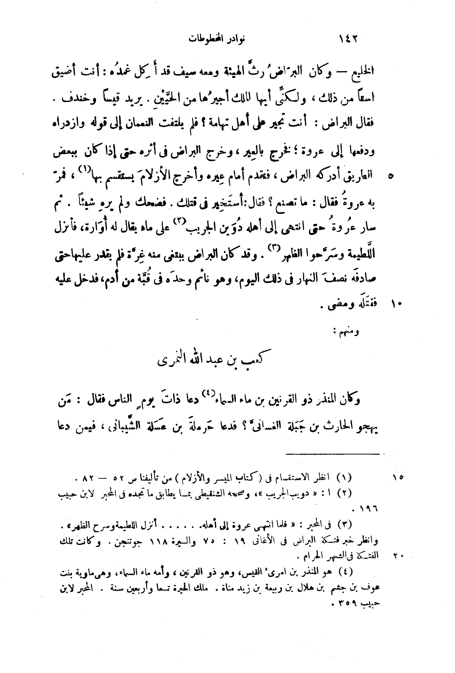الخليع وكان البراض رث الهيئة ومعه سيف قد أكل غمده: أنت أضيق استاً من ذلك، ولكني أيها الملك أجيرها من الحيين. يريد قيساً وخندف. فقال البراض: أنت تجير على أهل تهامة؟ فلم يلتفت النعمان إلى قوله وازدراه ودفعها إلى عروة؛ فخرج بالعير، وخرج البراض في أثره حتى إذا كان ببعض الطريق أدركه البراض، فقدم أمام عيره وأخرج الأزلام يستقسم بها، فمر به عروة فقال: ما تصنع؟ فقال: أستخير في قتلك. فضحك ولم يره شيئاً. ثم سار عروة حتى انتهى إلى أهله دوين الجريب على ماء يقال له أوراة، فأنزل اللطيمة وسرحوا الظهر. وقد كان البراض يبتغي منه غرة فلم يقدر عليها حتى صادفه نصف النهار في ذلك اليوم، وهو نائم وحده من أدم، فدخل عليه فقتله ومضى.