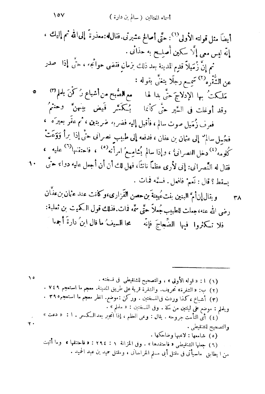 فعرف زميل صوت سالم، فأقبل إليه فضربه ضربتين، ثم عقر بعيره، فحمل سالم إلى عثمان بن عفان، فدفعه إلى طبيب نصراني حتى إذا برأ ووعت كلومه دخل النصراني، وإذا سالم يشامع امرأته، فاحتقنها عليه، فقال له النصراني: إني لأرى عظماً ناتئاً، فهل لك أن أجعل عليه دواء حتى يسقط؟ قال: نعم فافعل. فسمه فمات.