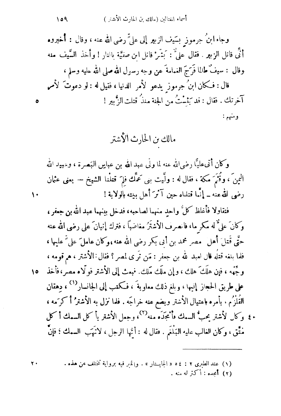 وكان أتى علياً رضي الله عنه بن عباس البصرة، وعبيد الله اليمن، وقثم مكة، فقال له: وليت بني عمك فلم قتلنا الشيخ يعني عثمان رضي الله عنه إنما قتلناه حين آثر أهل بيته بالولاية! فتقاولا فأغلط كل واحد منهما لصاحبه، فدخل بينهما عبد الله بن جعفر، وكان علي له مكرما، فانصرف الأشتر مغاضباً، فترك إتيان علي رضي الله عنه حتى قتل أهل مصر محمد بن أبي بكر رضي الله عنه، وكان عامل علي عليها، فلما بلغه قتله قال لعبد الله بن جعفر: من ترى لمصر؟ فقال: الأشتر، هم قومه، وجهه، فإن هلك هلك، وإن ملك ملك. فبعث إلى الأشتر فولاه مصر، فأخذ على طريق الحجاز إليها، وبلغ ذلك معوية، فكتب إلى الجانسار، دهقان القلزم، يأمره باغتيال الأشتر وبضع عنه خراجه. فلما نزل به الأشتر أكرمه، وكان الأشتر يحب السمك فأمجده منه، وجعل الأشتر يأكل السمك أكل متق، وكان الغالب عليه البلغم. فقال له: أيها الرجل، لا تهب السمك؛ فإن