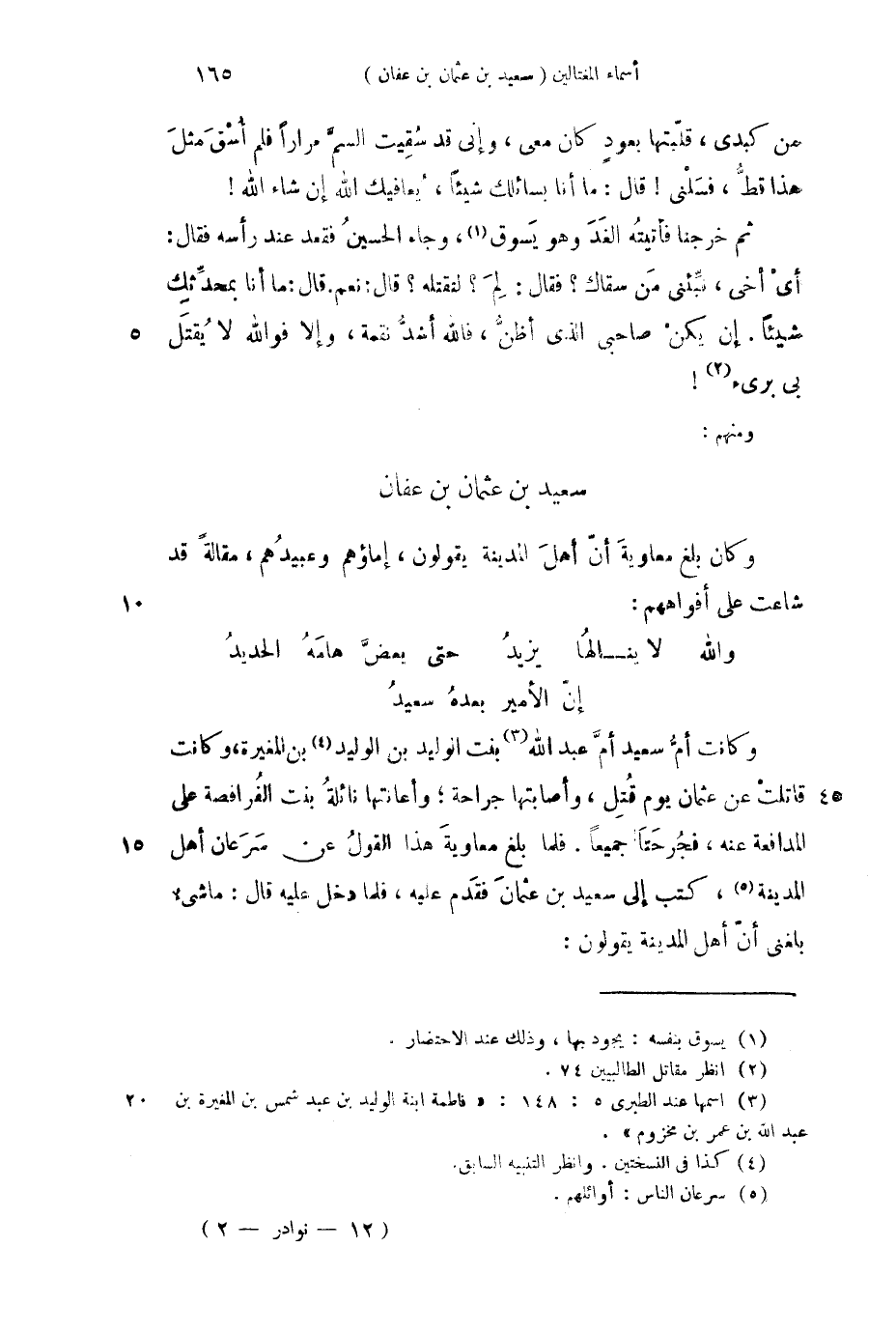 وكانت أم سعيد أم عبد الله بنت الوليد بن الوليد بن المغيرة، وكانت قاتلت عن عثمان يوم قتل، وأصابتها جراحة؛ وأعانتها نائلة بنت الفرافصة على المدافعة عنه، فجرحتا جميعاً. فلما بلغ معاوية هذا القول عن سرعان أهل المدينة، كتب إلى سعيد بن عثمان فقدم عليه، فلما دخل عليه قال: ما شيء بلغني أن أهل المدينة يقولون: