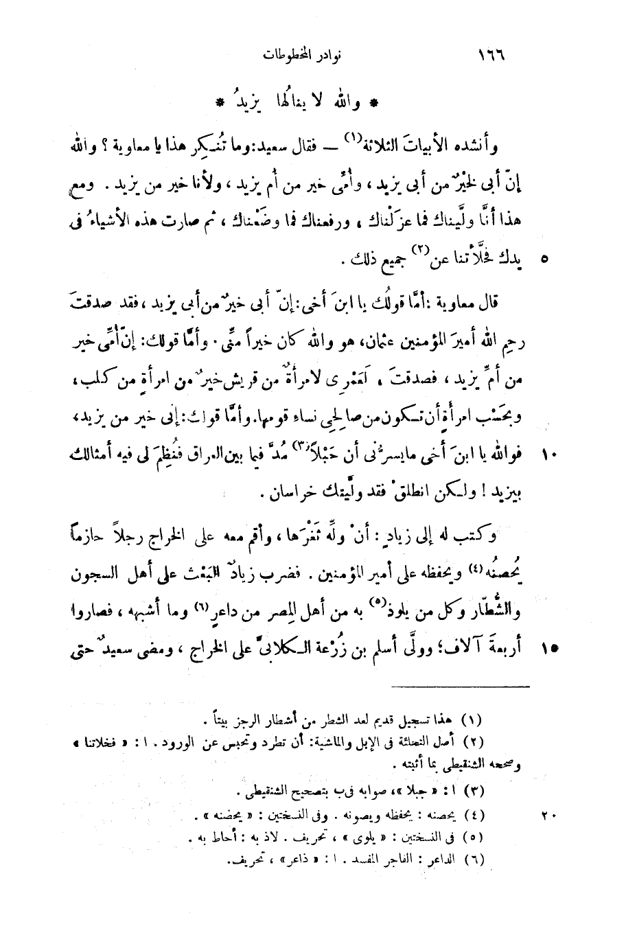 وأنشده الأبيات الثلاثة فقال سعيد: وما تنكر هذا يا معوية؟ والله إن بي لخير من أبي يزيد، ولأنا خير من يزيد. ومع هذا أنا وليناك فما عزلناك، ورفعناك فما وضعناك، ثم صارت هذه الأشياء في يدك فحلأتنا عن جميع ذلك.