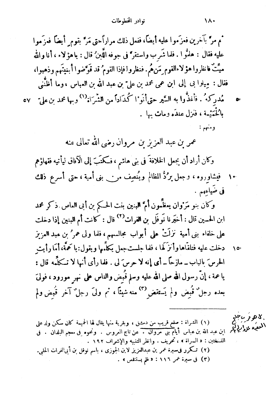 فلما شرب واستقر في جوفه اللبن قال: يا هؤلاء، أنا والله ميت فانظروا هؤلاء القوم من هم. فنظروا فإذا القوم قد قوضوا أبنيتهم وذهبوا، فقال: ميلوا بي إلى ابن عمي محمد بن علي بن عبد الله بن العباس، وما أظنني مدركه. فأغذوا به السير حتى أتوا كداداً من الشراة وبها محمد بن علي بالحميمة، فنزل عنده ومات بها.