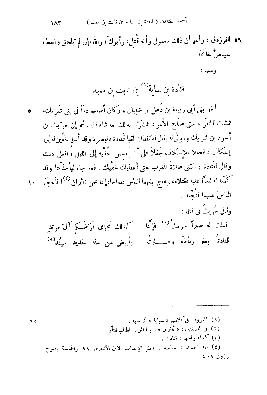 أخو بني ى أبي ربيعة بن ذهل بن شيبان، وكان أصاب دماً في بني شريك، فمشت السفراء حتى صلح الأمر، فمشوا بذلك ما شاء الله. ثم إن حريث بن أسود بن شريك ومولى له يقال له يقظان لقيا قتادة بالبصرة وقد أسلم خفين له إلى إسكاف، فجعلا للإسكاف جعلاً على أن يحبس خفيه إلى الليل، ففعل ذلك وقال لقتادة: ائتني صلاة للغرب حتى أعطيك خفَّيك: فلما جاء ليأخذها وقد كمنا له شداً عليه فقتلاه، وهاج بينهما الناس فصاحا: إنما نحن ثائران! فأحجم الناس عنهما فنجيا.