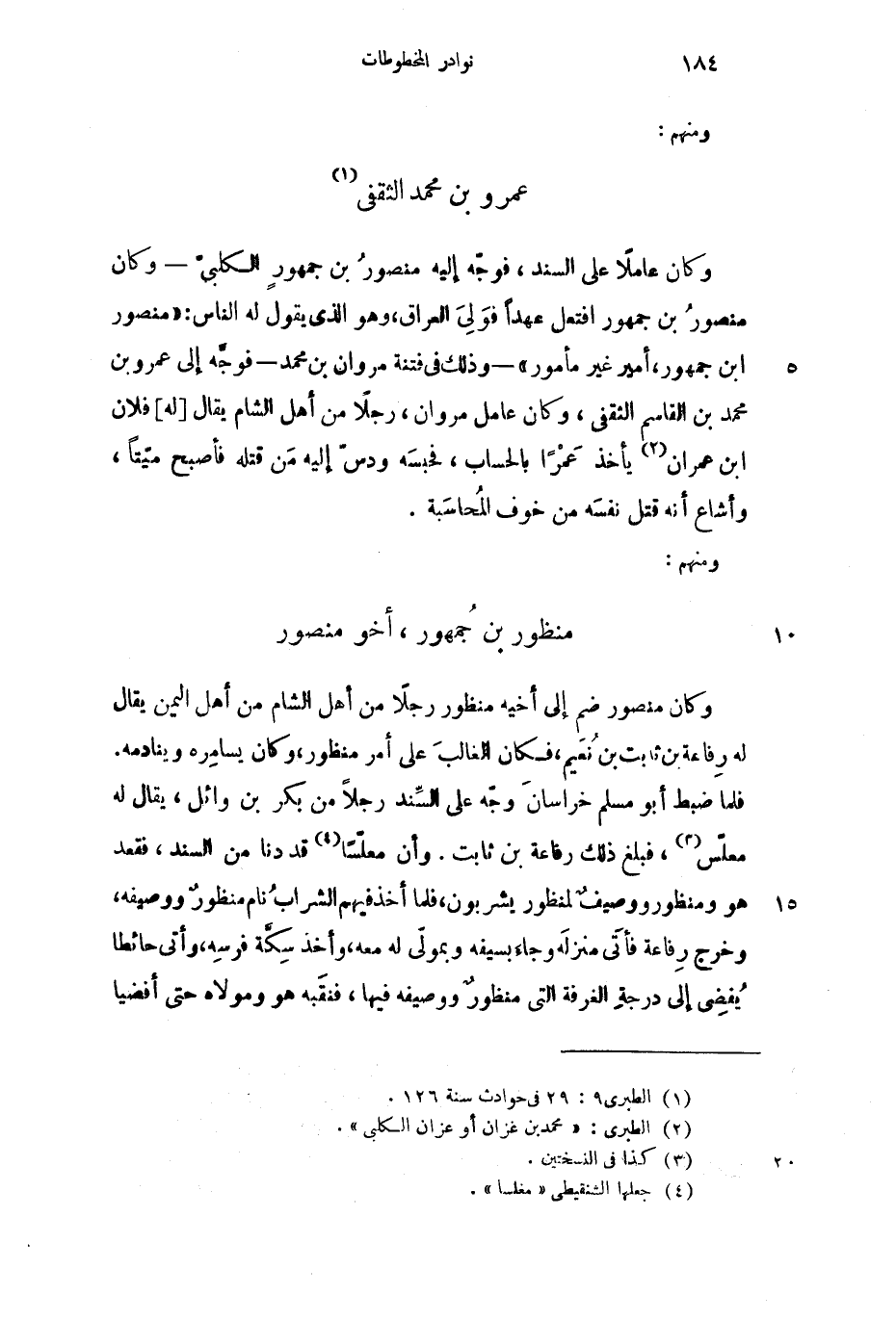 وكان عاملاً على السند، فوجه إليه منصور بن جمهور الكلبيّ وكان منصور بن جمهور افتعل عهداً فولى العراق، وهو الذي يقول له الناس: "منصور ابن جمهور، أمير غير مأمور" وذلك في فتنة مروان بن محمد فوجه إلى عمرو بن محمد بن القاسم الثقفي، وكان عامل مروان، رجلاً من أهل الشام يقال [له] فلان ابن عمران يأخذ عمراً بالحساب، فحبسه ودسّ إليه من قتله فأصبح ميتاً وأشاع أنه قتل نفسه من خوف المحاسبة.