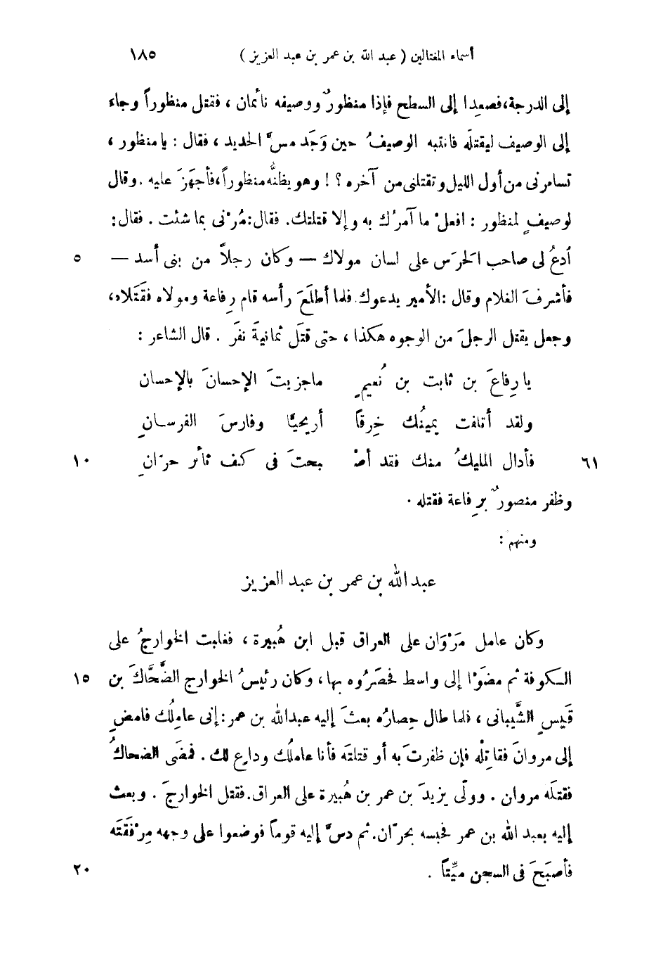 إلى الدرجة، فصعدا إلى السطح فإذا منظور ووصيفه نائمان، فقتل منظوراً وجاء على الوصيف ليقتله فانتبه الوصيف حين وجد مسَّ الحديد، فقال: يا منظور، تسامرني من أول الليل وتقتلني من آخره؟! وهو يظنه منظوراً، فأجهز عليه. وقال لوصيف لمنظور: افعل ما آمرك به وإلا قتلتك. فقال: مرني بما شئت. فقال: ادع لي صاحب الحرس على لسام مولاك وكان رجلاً من بني أسد فأشرف الغلام وقال: الأمير يدعوك فلما أطلع رأسه قام رفاعة ومولاه فقتلاه، وجعل يقتل الرجل من الوجوه هكذا، حتى ثمانية نفر. قال الشاعر: