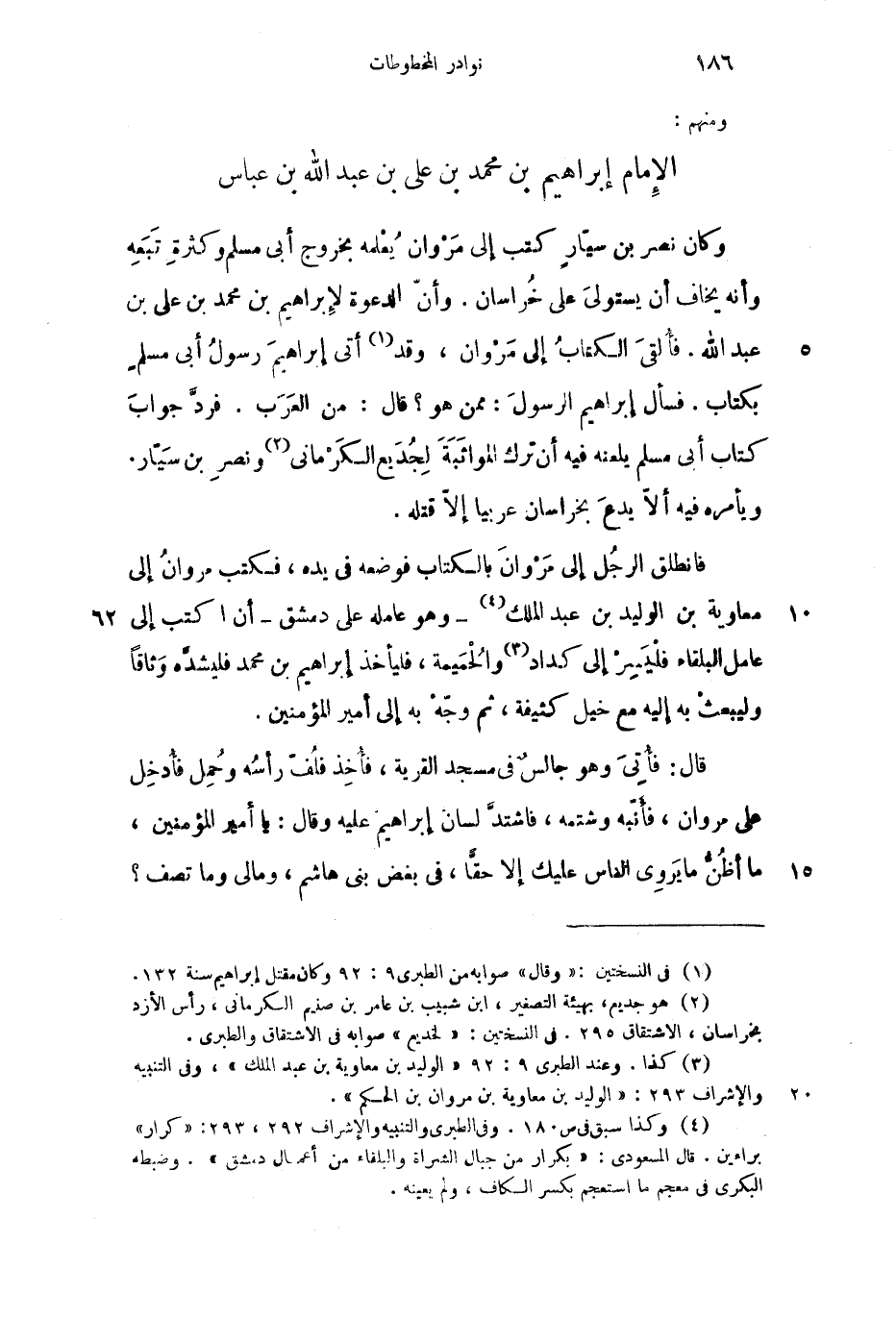 فانطلق الرجل إلى مروان بالكتاب فوضعه في يده، فكتب مروان إلى معاوية بن الوليد ب عبد الملك وهو عامله على دمشق أن اكتب إلى عامل البلقاء فليسر إلى كداد والحميمة، فليأخذ إبراهيم بن محمد فليشَّده وثاقاً وليبعث به إليه مع خيل كثيفة، ثم وجه به إلى أمير المؤمنين.