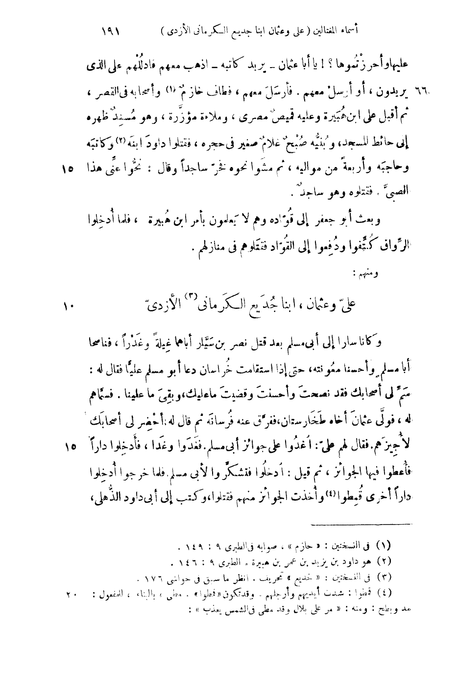 وكانا سارا إلى أبي مسلم بعد قتل نصر بن سيلر أباهما غيلة وغدراً، فناصحا أبا مسلم وأحسنا معونته، حتى إذا استقامت خراسان دعا أبو مسلم عليا فقال له: سم لي أصحابك فقد نصحت وأحسنت وقضيت ما عليم، وبقى ما علينا. فسماهم له، فولى عثمان أخاه طخارستان، ففرق عنه فرسانه ثم قال له: أحضر لي أصحابك لأجيزهم. فقال لهم عليّ: اغدوا على جوائز أبي مسلم. فغدوا وغدا، فأدخلوا داراً فأعطوا فيها الجوائز، ثم قيل: ادخلوا فتشكروا لأبي مسلم فلما خرجوا أدخلوا داراً أخرى قُمطوا وأخذت الجوائز منهم فقتلوا، وكتب إلى أبي داود الذُّهلى،