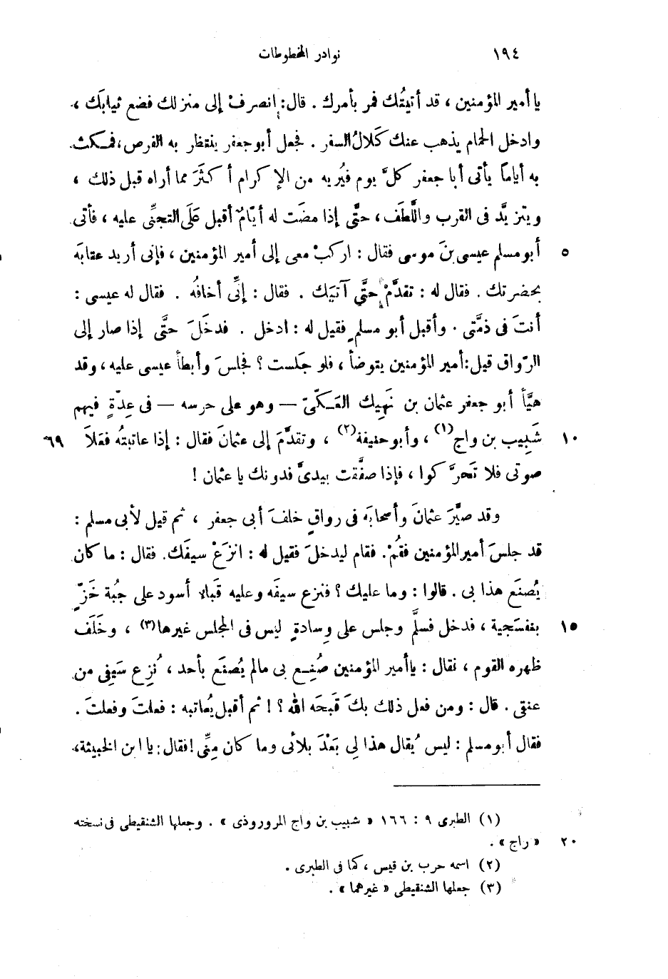 يا أمير المؤمنين، قد أتيتك فمر بأمرك. قال: انصرف إلى منزلك فضع ثيابك، وادخل الحمام يذهب عنك كلال السفر. فجعل أبو جعفر ينتظر به الفرص، فمكث به أياماً يأتي أبا جعفر كلَّ يوم فيريه من الإكرام أكثر مما أراه قبل ذلك، ويتزيد في القرب واللطف، حتى إذا مضت له أيامٌ أقبل على التجني عليه، فأتى أبو مسلم عيسى بن موسى فقال: اركب معي يا أمير المؤمنين، فإني أريد عقابه بحضرتك. فقال له: تقدم حتى آتيك. فقال: إني أخافه. فقال له عيسى: أنت في ذمتي. وأقبل أبو مسلم فقيل له: ادخل. فدخل حتى إذا صار إلى الرواق قيل: أمير المؤمنين يتوضأ، فلو جلست؟ فجلس وأبطأ عيسى عليه، وقد هيأ أبو جعفر عثمان بن نهيك العكيّ وهو على حرسه في عدةٍ فيهم شبيب بن واج، وأبو حنيفة، وتقدم إلى عثمان فقال: إذا عاتبته فعلا صوتي فلا تحرَّكوا، فإذا صفقت بيدي فدونك يا عثمان! وقد صيَّر عثمان وأصحابه في رواقٍ خلف أبي جعفر، ثم قيل لأبي مسلم: قد جلس أمير المؤمنين فقم. فقام ليدخل فقيل له: انزع سلفك. فقال: ما كان يصنع هذا بي. قالوا: وما عليك؟ فنزع سيفه وعليه قباءٌ أسود على جبة خزٍ بنفسجية، فدخل فسلم وجلس على وسادةٍ ليس في المجلس غيرها، وخلف ظهره القوم، فقال: يا أمير المؤمنين صنع بي ما لم يصنع بأحد، نزع سيفي من عنقي قال: ومن فعل ذلك بك قبحه الله؟! ثم أقبل يعاتبه: فعلت وفعلتَ. فقال أبو مسلم: ليس يقال هذا لي بعد بلائي وما كان مني! فقال: يا ابن الخبيثة