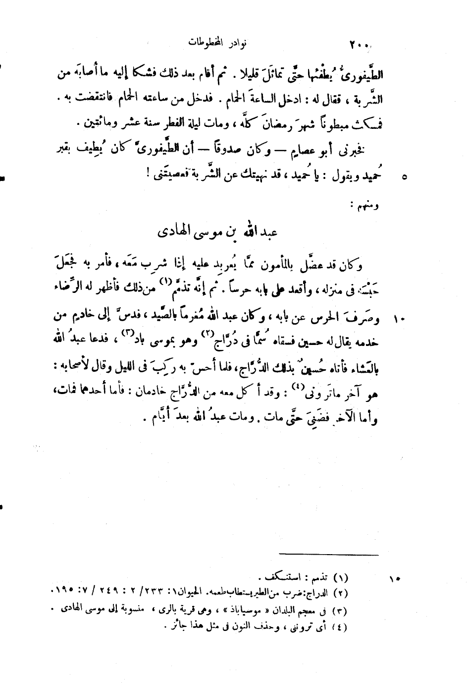 وكان قد عضَّل بالمأمون مما يعربد عليه إذا شرب معه، فأمر به فجعل حبسه في منزله، وأقعد على بابه حرساً. ثم إنه تذمم من ذلك فأظهر له الرضاء وصرف الحرس عن بابه، وما كان عبد الله مغرماً بالصيد، فدس إلى خادم من خدمه يقال له حسين فسقاه سماً في درَّاج وهو بموسى باد، فدعا عبد الله بالعشاء فأتاه حسين بذلك، فلما أحس به ركب في الليل وقال لأصحابه: هو آخر ما تروني: وقد أكل معه من الدُّرَّاج خادمان: فأما أحدهما فمات، وأما الآخر فضني حتى مات، ومات عبد الله بعد أيام.