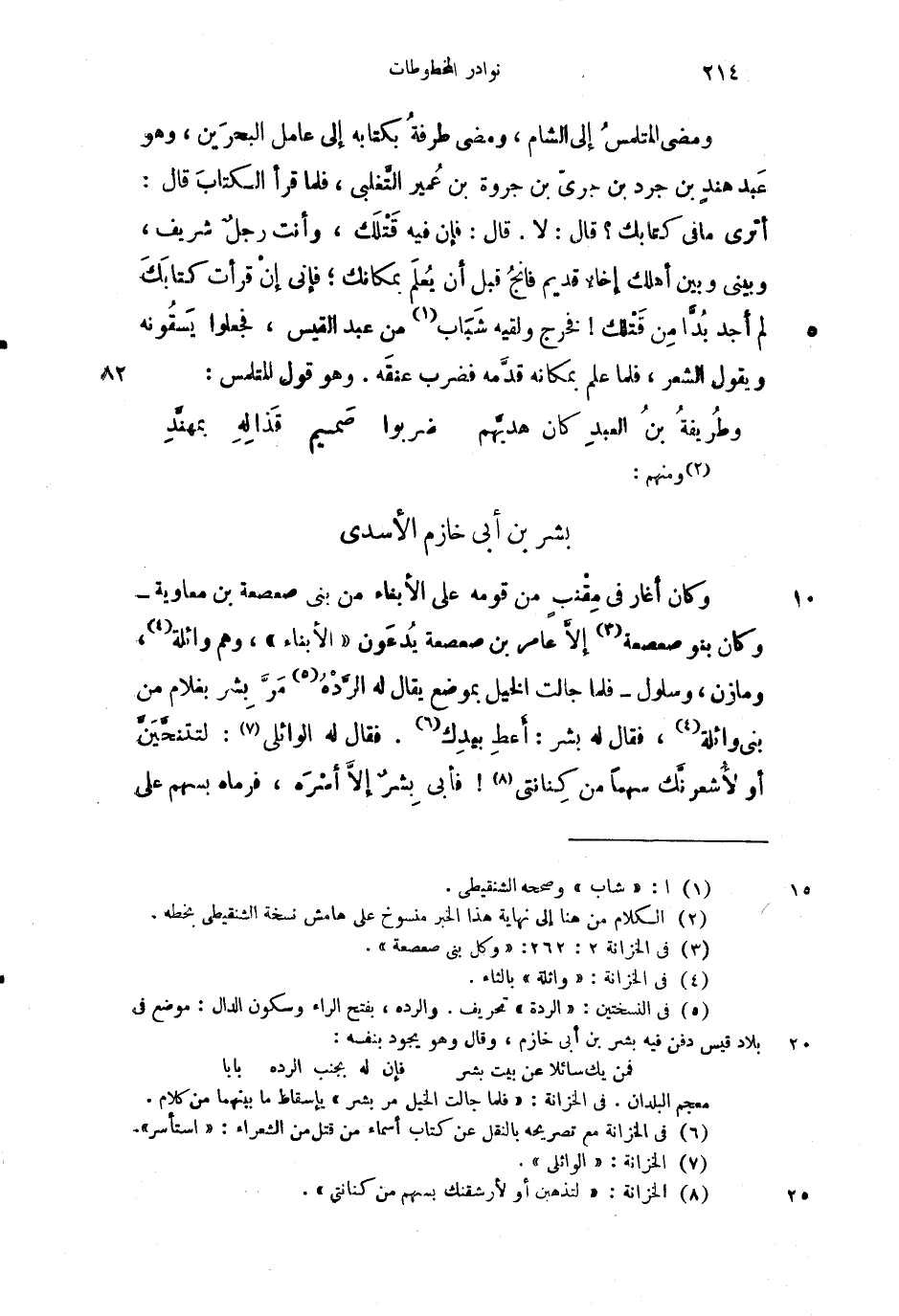 وكان أغار في مقنبٍ من قومه على الأبناء من بني صعصعة بن معاوية وكان بنو صعصعة إلاَّ عار بن صعصعة يدعون "الأبناء"، وهم وائلة، ومازن، وسلول فلما جالت الخيل بموضع يقال له الردة مرَّ بشر بغلام من بني وائلة، فقال له بشر: أعط بيدك. فقال له الوائلي: لتتنحين أو لأشعرنك سهماً من كنانتي! فأبى بشرٌ إلاَّ أسره، فرماه بسهم على
