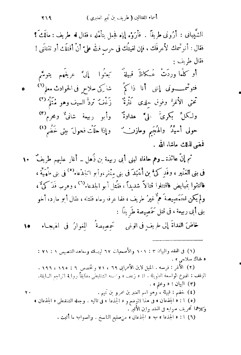 الشيباني: أروني طريفاً. فأروه إياه فجعل يتأمله، فقال له طريف: مالك؟ فقال: أنوسمك لأعرفك، فإن لقيتك في حرب فلله على أن أقتلك أو تقتلني! فقال طريف: