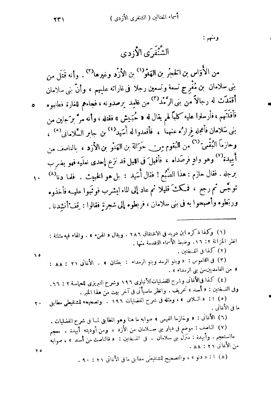 من الأواس بن الحجر بن الهفو بن الأزد وغيرها. وأنه قتل من بني سلامان بن مفرج تسعة وتسعين رجلاً في غاراته عليهم، وأن بني سلامان أقعدت له رجلاً من بني الرمد من غامد يرصدونه، فجاءهم للغارة فطلبوه فأفلتهم، فأرسلوا عليه كلباً لهم يقال له "حبيش" فقتله، وأنه مر برجلبين من بني سلامان فأعجله فراره عنهما، فأقعدوا له أسيد بن جابر السلاماني، وحازماً البقمى من البقوم من حوالة بن الهنو بن الأزد، بالناصف من أبيدة وهو واد فرصداه، فأقبل في الليل قد نزع إحدى نعليه فهو يضرب برجله. فقال حازم: هذا الضبع! فقال أُّسيد: بل هو الخبيث. فلما دنا توجس ثم رجع، فمكث قليلاً ثم عاد إلى الماء ليشرب فوثبوا عليه فأخذوه وربطوه وأصبحوا به في بني سلامان، فربطوه إلى شجرة فقالوا: قف أنشدنا.