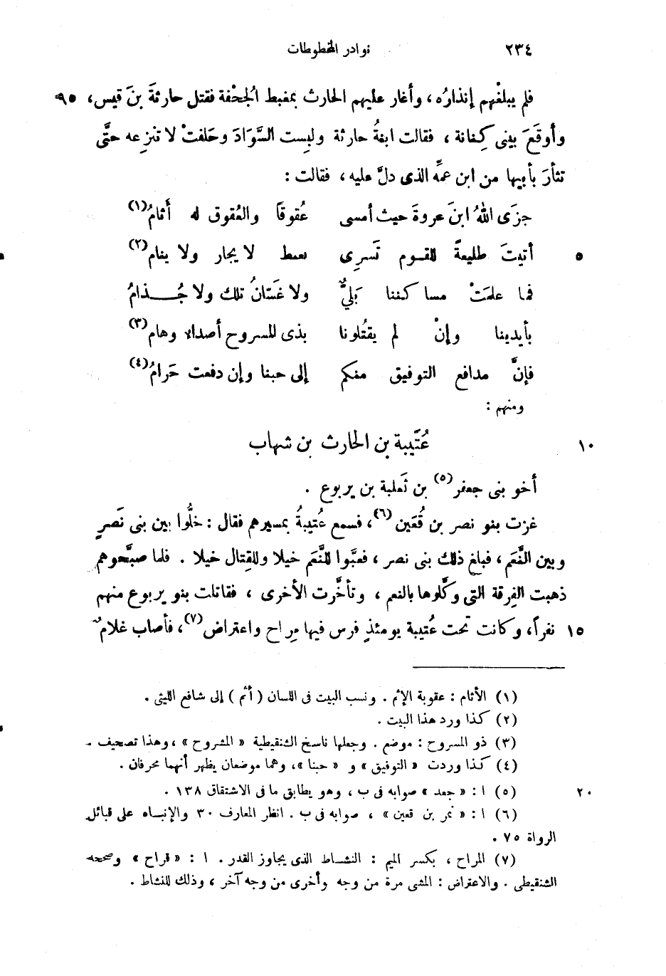 غزت بنو نصر بن قعين، فسمع عتيبة بمسيرهم فقال: خلوا بين بني نصر وبين النعم، لا فبلغ ذلك بني نصر، فعبوا للنعم خيلاً وللقتال خيلاً. فلما صبحوهم ذهبت الفرقة التي وكلوها بالنعم، وتأخرت الأخرى، فقاتلت بنو يربوع منهم نفراً، وكانت تحت عتيبة يومئذ فرس فيها مراح واعتراض، فأصاب غلامٌ
