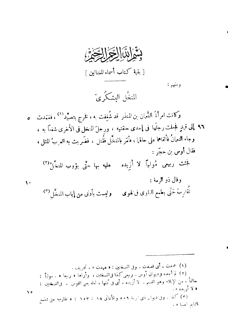 وكانت امرأة النعمان بن المنذر قد شغفت به، فخرج يتصيد، فعمدت إلى قيد فجعلت رجلها في إحدى حلقتيه، ورجل المنخل في الأخرى شغفاً به، وجاء النعمان فألقاهما على حالهما، فأمر بالمنخل فقتل، فضربت به العرب المثل، فقال أوس بن حجر: