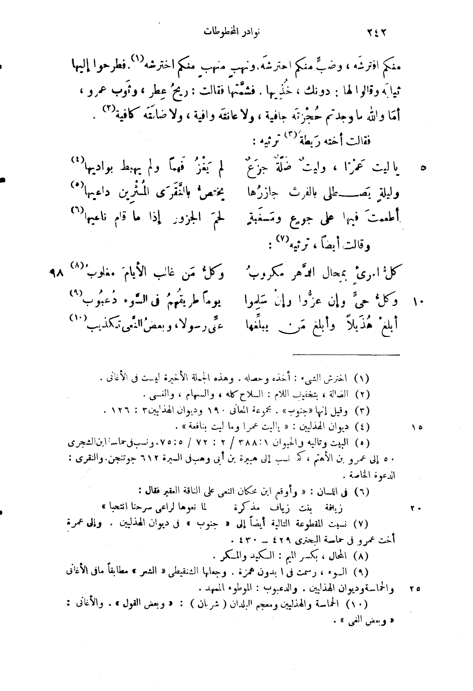 منكم افترسه، وضبٍّ منكم احترشه. ونهب منهب منكم اخترشه. فطرحوا إليها ثيابه وقالوا لها: دونك، خذيها. فشمتها فقالت: ريح عطر، وثوب عمرو، أما والله ما وجدتم حجزته جافية، ولا عانته وافية، ولا ضالته كافية.