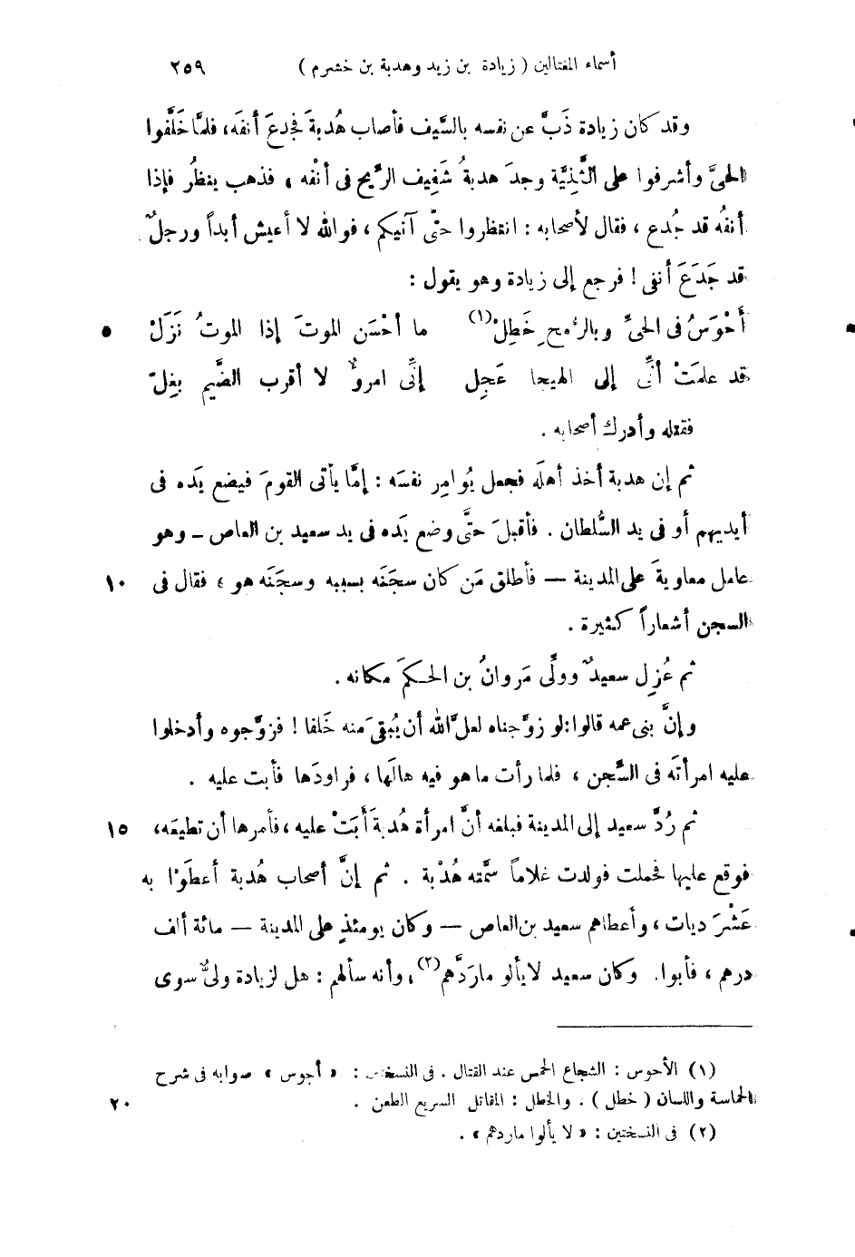 وقد كان زيادة ذبَّ عن نفسه بالسيف فأصاب هدبة فجدع أنفه، فلما خلفوا الحي وأشرفوا على الثنية وجد هدبة شغيف الريح في أنفه، فذهب ينظر فإذا أنفه قد جدع، فقال لأصحابه: انتظروا حتى آتيكم، فوالله لا أعيش أبداً ورجلٌ قد جدع أنفي! فرجع إلى زيادة وهو يقول: