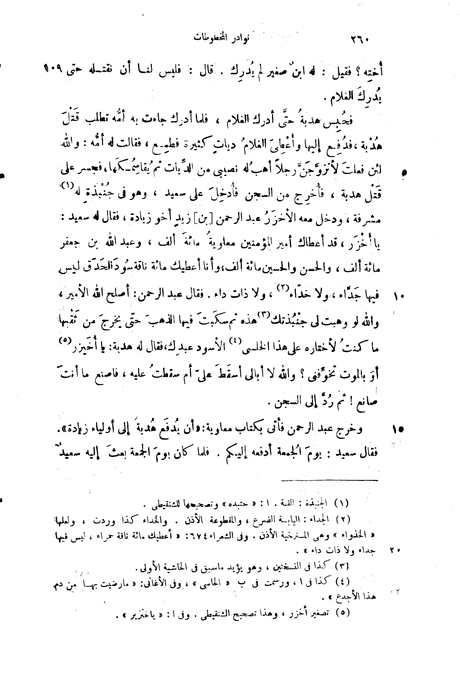 فحبس هدبة حتى أدرك الغلام، فلما أدرك جاءت به أمه تطلب قتل هدبة، فدفع إليها وأعطى الغلام ديات كثيرة فطمع، فقالت له أمه: والله لئن فعلت لأتزوجن رجلاً أهب له نصيبي من الديات ثم يقاسمكها، فجسر على قتل هدبة، فأخرج من السجن فأدخل على سعيد، وهو في جنبذة له مشرفة، ودخل معه الأخزر عبد الرحمن [بن] زيد أخو زيادة، فقال له سعيد: يا أخزر، قد أعطاك أمير المؤمنين معاوية مائة ألف، وعبد الله بن جعفر مائة ألف، والحسن والحسين مائة ألف، وأنا أعطيك مائة ناقة سود الحدق ليس فيها جداء، ولا خداء، ولا ذات داء. فقال عبد الرحمن: أصلح الله الأمير، والله لو وهبت لي جنبذتك هذه ثم سكبت فيه الذهب حتى يخرج من ثقبها ما كنت لأختاره على هذا الخلسى الأسود عبدك، فقال له هدبة: ياأخزر أو بالموت تخوفني؟ والله لا أبالي أسقط على أم سقطت عليه، فاصنع ما أنت صانع! ثم رد إلى السجن.