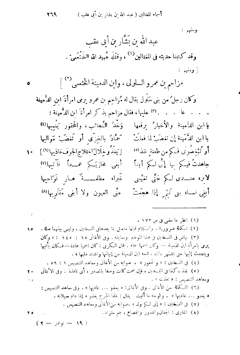 وقد كتبنا حديثه في المغتالين، وقتله عبيد الله الخثعمي مزام بن عمرو السولي، وابن الدمينة الخثعمي] وكان رجل من بني سلول يقال له مزاحم بن عمرو يرمى امرأة ابن الدمينة....عا.....عليها، فقال مزاحم يذكر امرأة ابن الدمينة: