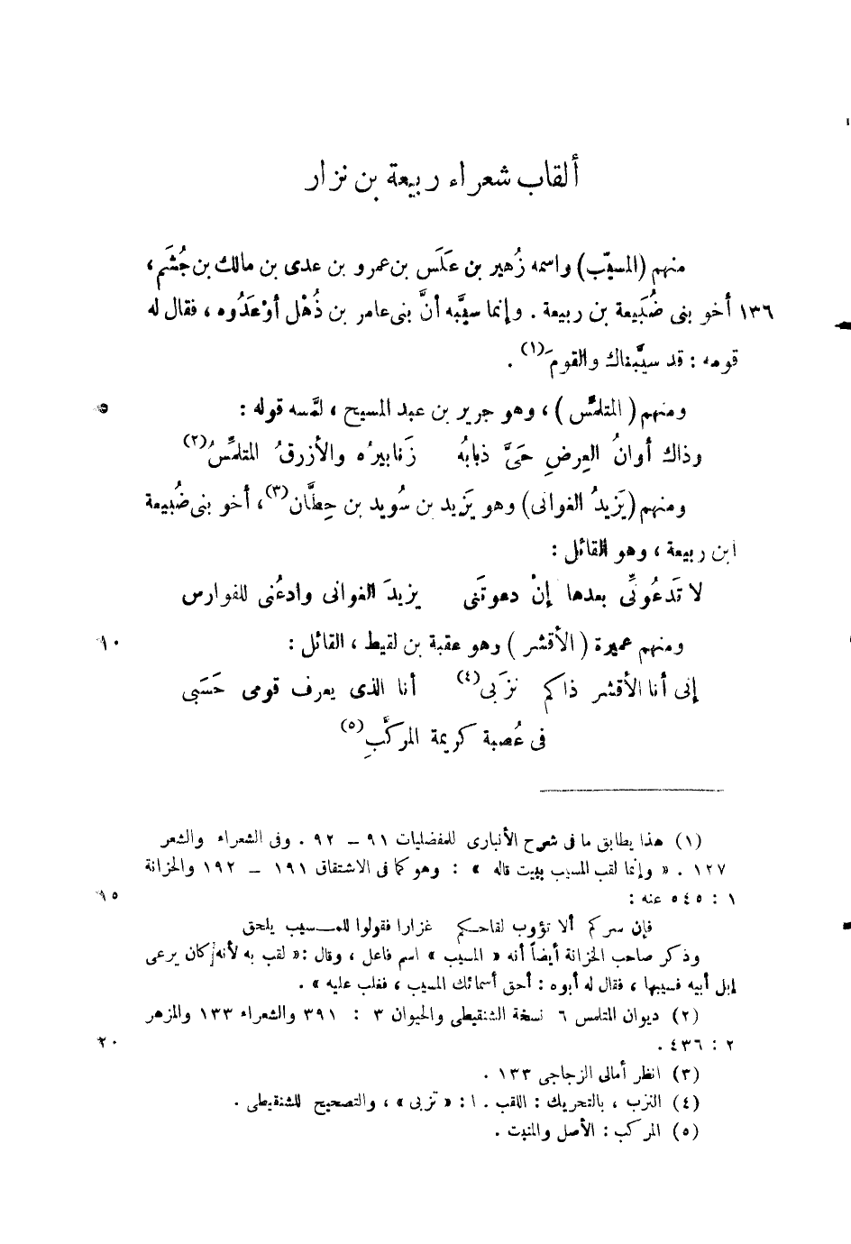 منهم (المسيب) واسمه زهير بن علس بن عمرو بن عدي بن مالك بن جشم، أخو بني ضبيعة بن ربيعة، وإنما سيبه أن بني عامر بن ذهل أوعدوه، فقال له قومه: قد سيبناك والقوم.