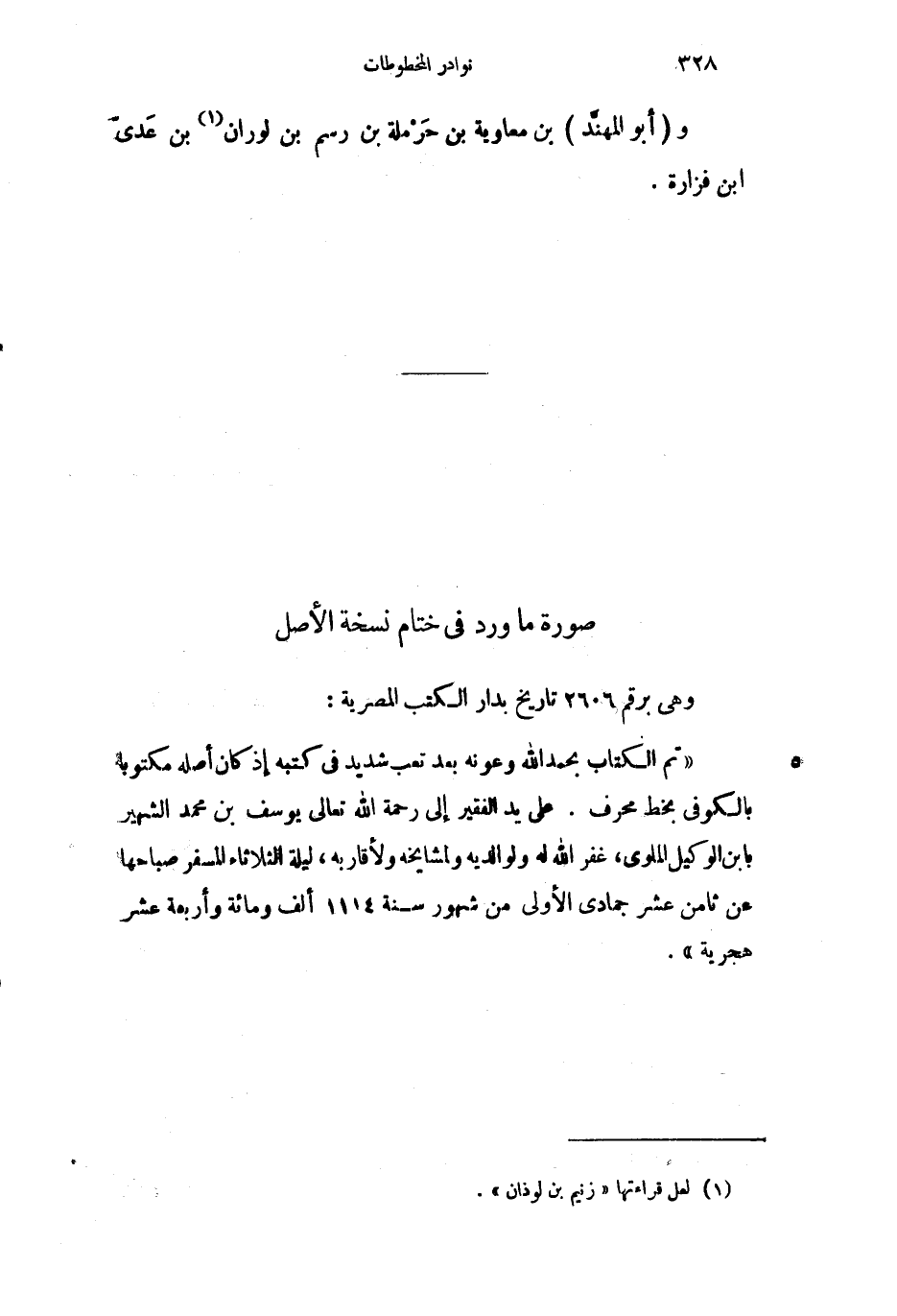 "تم الكتاب بحمد الله وعونه بعد تعب شديد في كتبه إذا كان أصله مكتوباً بالكوفى بخط محرف، على يد الفقير إلى رحمة الله تعالى يوسف بن محمد الشهير بابن الوكيل الملوى، غفر الله له ولوالديه ولمشايخه ولأقاربه، ليلة الثلاثاء المسفر صباحها عن ثامن عشر جمادى الولى من شهور سنة 1114 ألف ومائة وأربعة عشر هجرية".