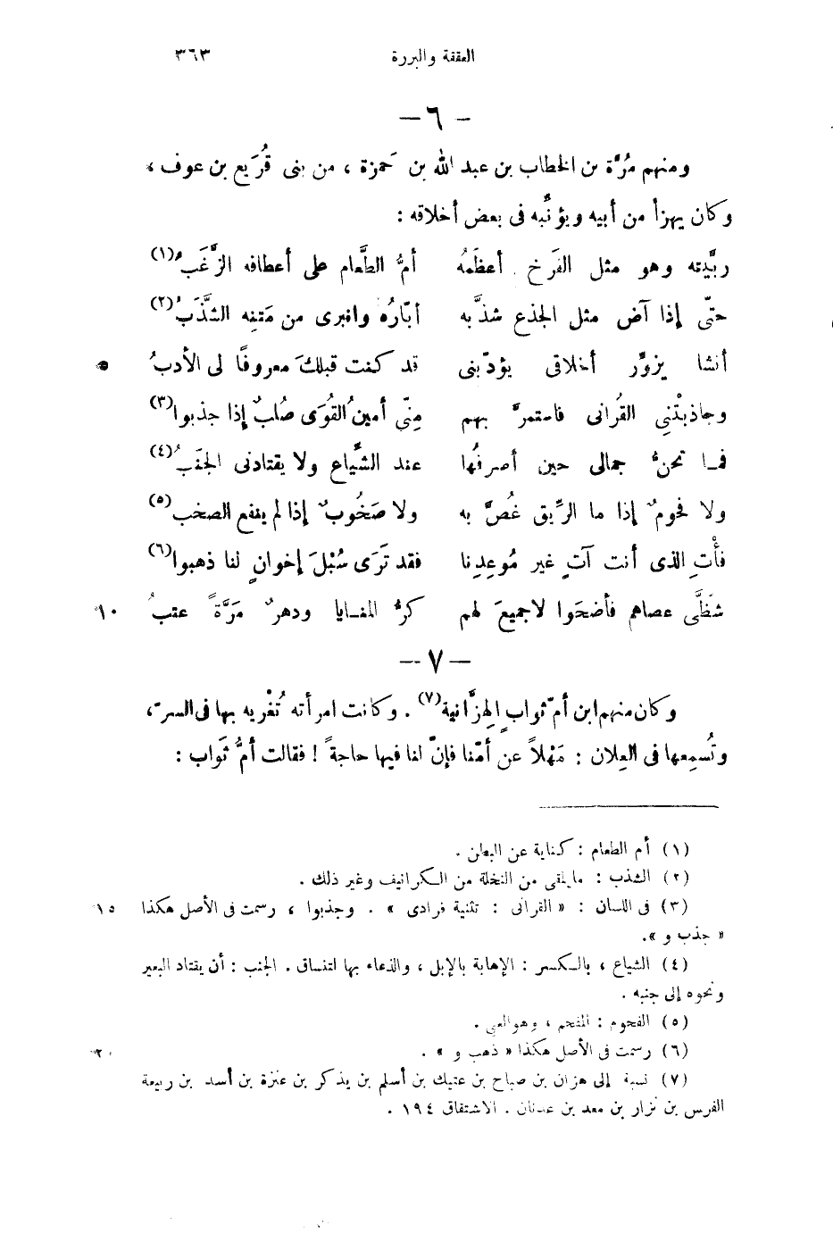 وكان منهم ابن أم ثواب الهزانية، وكانت امرأته تغربه بها في السر، وتسمعها في العلان: مهلاً عن أمنا فإن لنا فيها حاجةً! فقالت أم ثواب: