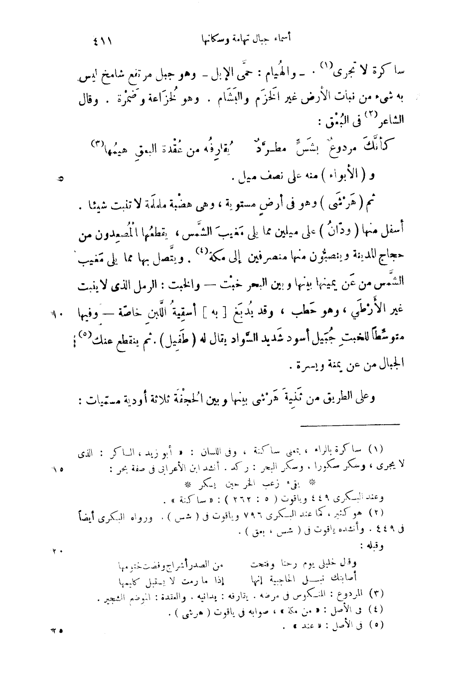 ثم (هرشى) وهو في أرض مستوية، وهي هضبة ململمة لا تنبت شيئاً، أسفل منها (ودان) على ميلين مما يلي مغيب الشمس، يقطعها المصعدون من حجاج المدينة وينصبون منها بينها وبين البحر خبت، والخبت: الرمل الذي لا ينبت غير الأرطي، وهو حطب، وقد يدبغ [به] أسقية اللبن خاصة، وفيها متوسطاً للخبت جبيل أسود شديد السواد يقال له (طفيل) ثم ينقطع عنك الجبال من عن يمنة ويسرة.