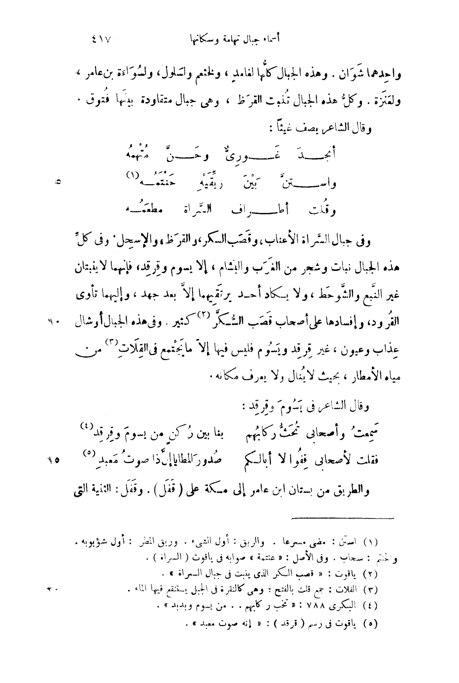 وفي جبال السراة الأعناب، وقصب السكر، والقرظ، والإسحل وف يكل هذه الجبال نبات وشجر من الغرب والبشام، إلا يسوم وقرقد، فإنهما لا ينبتان غير النبع والشحط، ولا يكاد أحد يرتقيهما إلا بعد جهد، وإليهما تأوى القرود، وإفسادها على أصحاب قصب السكر، كثير وفي هذه الجبال أوشال عذاب وعيون، غير قرقد ويسوم فليس فيها إلا ما يجتمع في القلات من مياه الأمطار، بحيث لا ينال ولا يعرف مكانه.