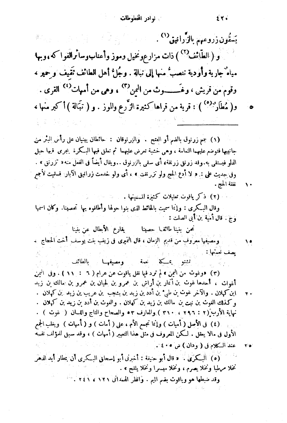 و (الطائف) ذات مزارع ونخيل وموز وأعناب وسائر الفواكه، وبها مياه جارية وأودية تنصب منها إلى تبالة، وجل أهل الطائف ثقيف وحمير، وقومٌ من قريش، وغوث من اليمن، وهي من أمهات القرى، و (مطار) : قرية من قراها كثيرة والموز، و (تبالة) اكبر منها،