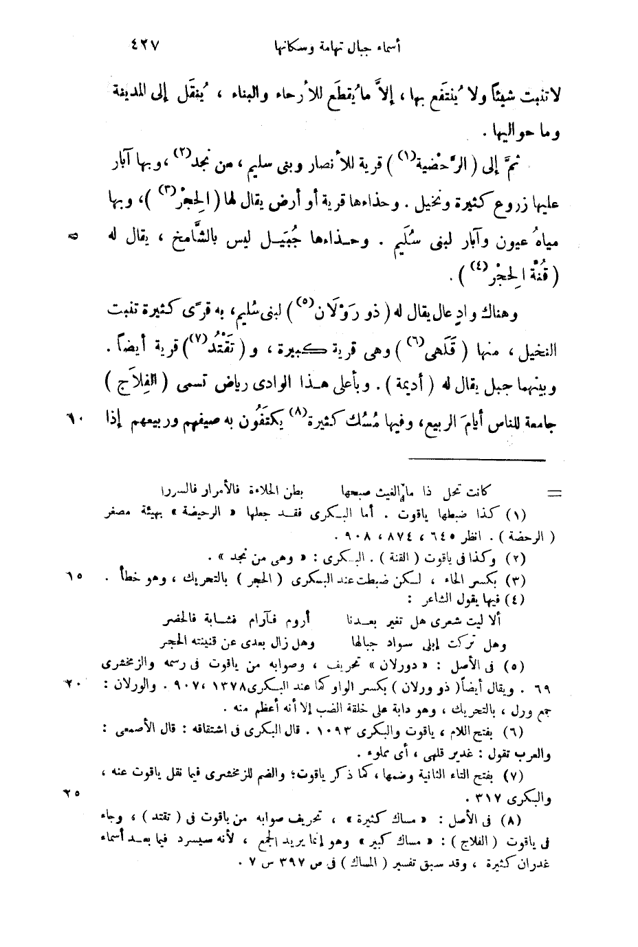 ثم إلى (الرحضية) قرية للنصار وبني سليم، من نجد، وبها آبار عليها زروع كثيرة ونخيل، وحذاءها قرية أو أرض يقال لها (الحجر) ، وبها مياه عيون وآبار لبني سليم، وحذاءها جبيل ليس بالشامخ، يقال له (قنة الحجر) .