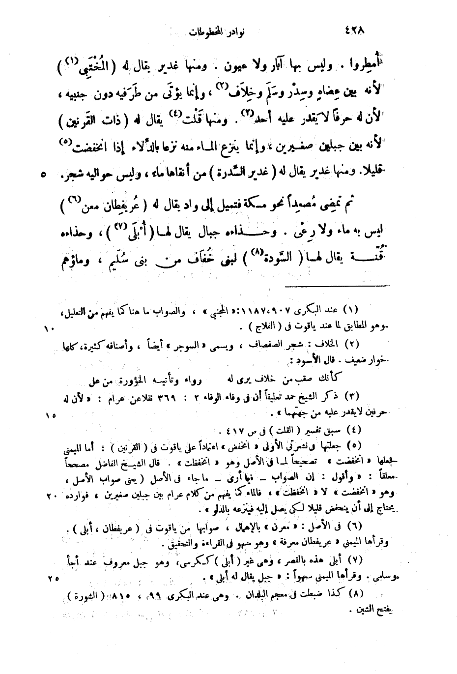 أمطروا، وليس بها آبار ولا عيون، ومنها غدير يقال له (المختبي) لأنه بين عضاه وسدر وسلم وخلاف، وإنما يؤتى من طرفيه دون جنبيه، لأن له حرفاً لا يقدر عليه أحد، ومنها قلت يقال له (ذات القرنين) لنه بين جبلين صغيرين، وغنما ينزع الماء منه نزعاً بالدلاء إذا انخفضت قليلاً، ومنها غدير يقال له (غدير السدرة) من أنقاها ماء، وليس حواليه شجر، ثم تمضي مصعداً نحو مكة فتميل إلى واد يقال له (عريفطان معن) ليس به ماء ولا رعى، وحذاءه جبال يقال لها (أبلى) ، وحذاءه قنة يقال لها (السودة) لبني خفاف من بني سليم، وماؤهم