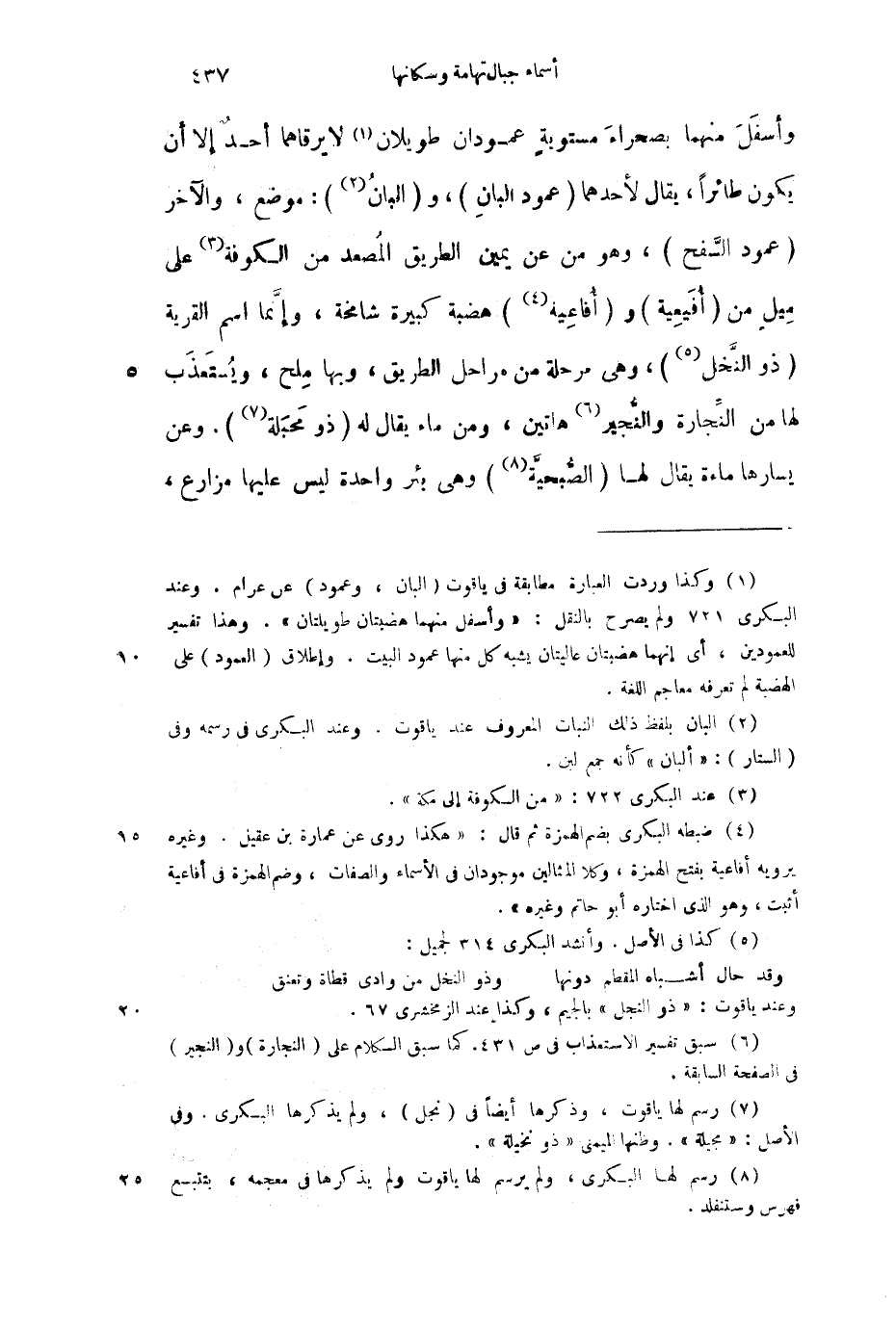 وأسفل منها بصحراء مستوية عمودان طويلان لا يرقاهما أحد إلا أن يكون طائراً، يقال لحدهما (عمود البان) ، و (البان) : موضع، والآخر (عمود السفح) ، وهو من عن يمين الطريق المصعد من الكوفة على ميل من (أفيعية) و (أفاعية) هضبة كبيرة شامخة، وظغنما اسم القرية (ذو النخل) ، وهي مرحلة من مراحل الطريق، وبها ملح، ويستعذب لها من النجارة والنجير هاتين، ومن ماء يقال له (ذو محبلة) وعن يسارها ماءة يقال لها (الصبحية) وهي بئر واحدة ليس عليها مزارع،