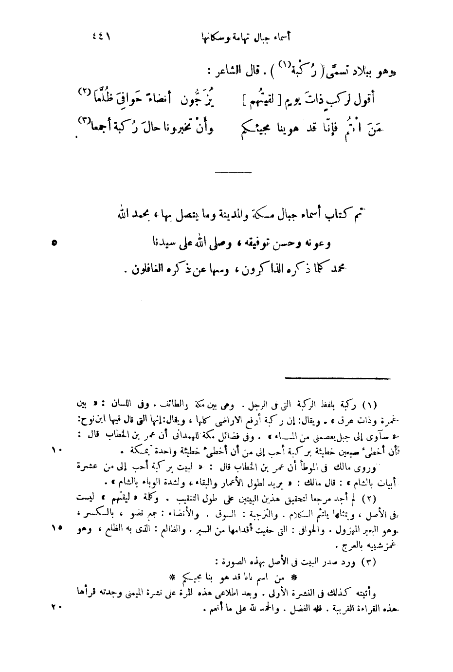 تم كتاب أسماء جبال مكة والمدينة وما يتصل بها، بحمد الله وعونه وحسن توفيقه، وصلى الله على سيدنا محمد كلما ذكره الذاكرون، وسها عن ذكره الغافلون.