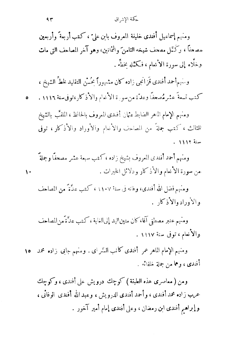 ومنهم أحمد أفندي المعروف بشيخ زاده، كتب سبعة عشر مصحفاً وجملة من سورة الأنعام والأذكار ودلائل الخيرات.