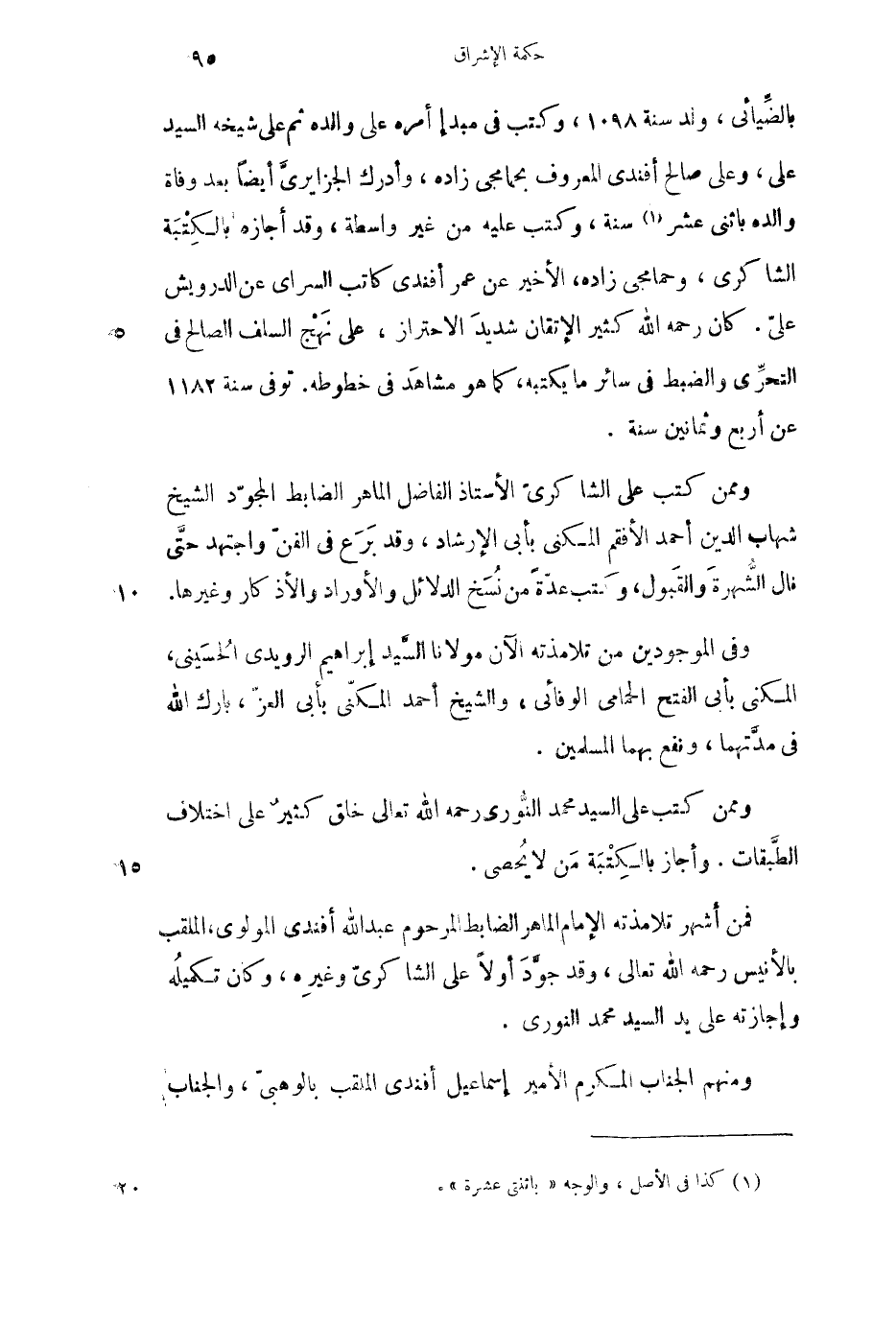بالضيائي، ولد سنة 1098، وكتب في مبدأ أمره على والده ثم على شيخه السيد علي، وعلي صالح أفندي المعروف بحمامجي زاده، وأدرك الجزائري أيضاً بعد وفاة والده باثني عشر سنة، وكتب عليه من غير واسطة، وقد أجازه بالكتبة الشاكري، وحمامجي زاده، الأخير عن عمر أفندي كاتب السراي عن الدرويش علي. كان رحمه الله كثير الإتقان شديد الاحتراز، على نهج السلف الصالح في التحري والضبط في سائر ما يكتبه، كما هو مشاهد في خطوطه. توفى سنة 1182 عن أربع وثمانين سنة.