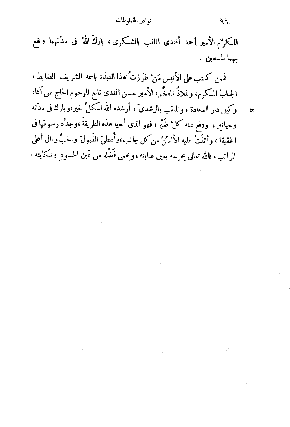 فمن كتب على الأنيس من طرزت هذا النبذة باسمه الشريف الضابط، الجناب المكرم، والملاذ المفخم، الأمير حسن أفندي تابع المرحوم الحاج علي آغا، وكيل دار السعادة، والملقب بالرشدي، أرشده الله لكل خير، وبارك في مدته وحياته، ودفع عنه كل ضير، فهو الذي أحيا هذه الطريقة، وجدد رسومها في الحقيقة، وأثنت عليه الألسن من كل جانب، وأعطى القبول والحب ونال أعلى المراتب، فالله تعالى يحرسه بعين عنايته، ويحمي فضله من عين الحسود ونكايته.