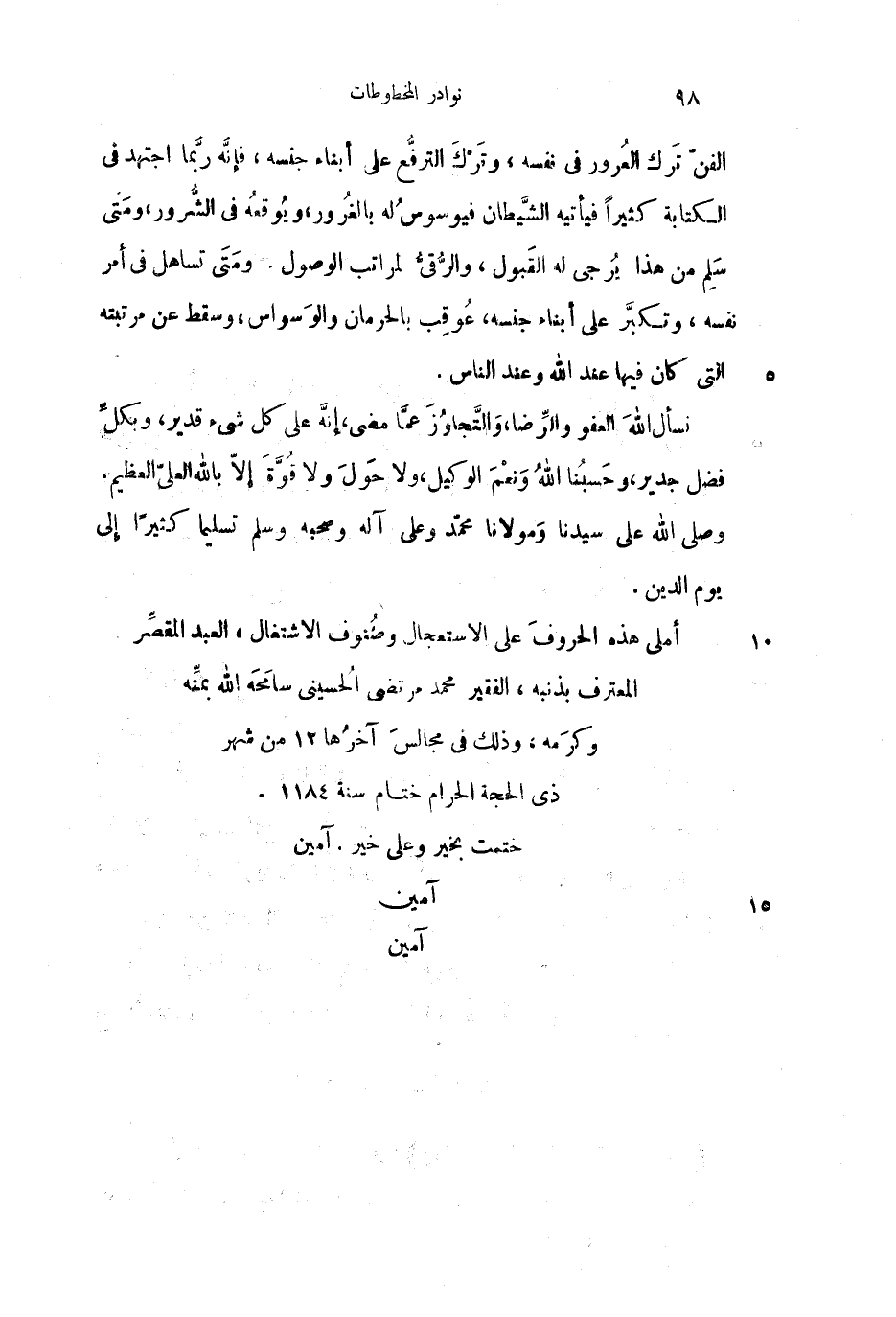أملي هذه الحروف على الاستعجال وصنوف الاشتغال، العبد المقصر المعترف بذنبه، الفقير محمد مرتضى الحسيني سامحه الله بمنه وكرمه، وذلك في مجالس آخرها 12 من شهر ذي الحجة الحرام ختام سنة 1184. ختمت بخير وعلى خير. آمين