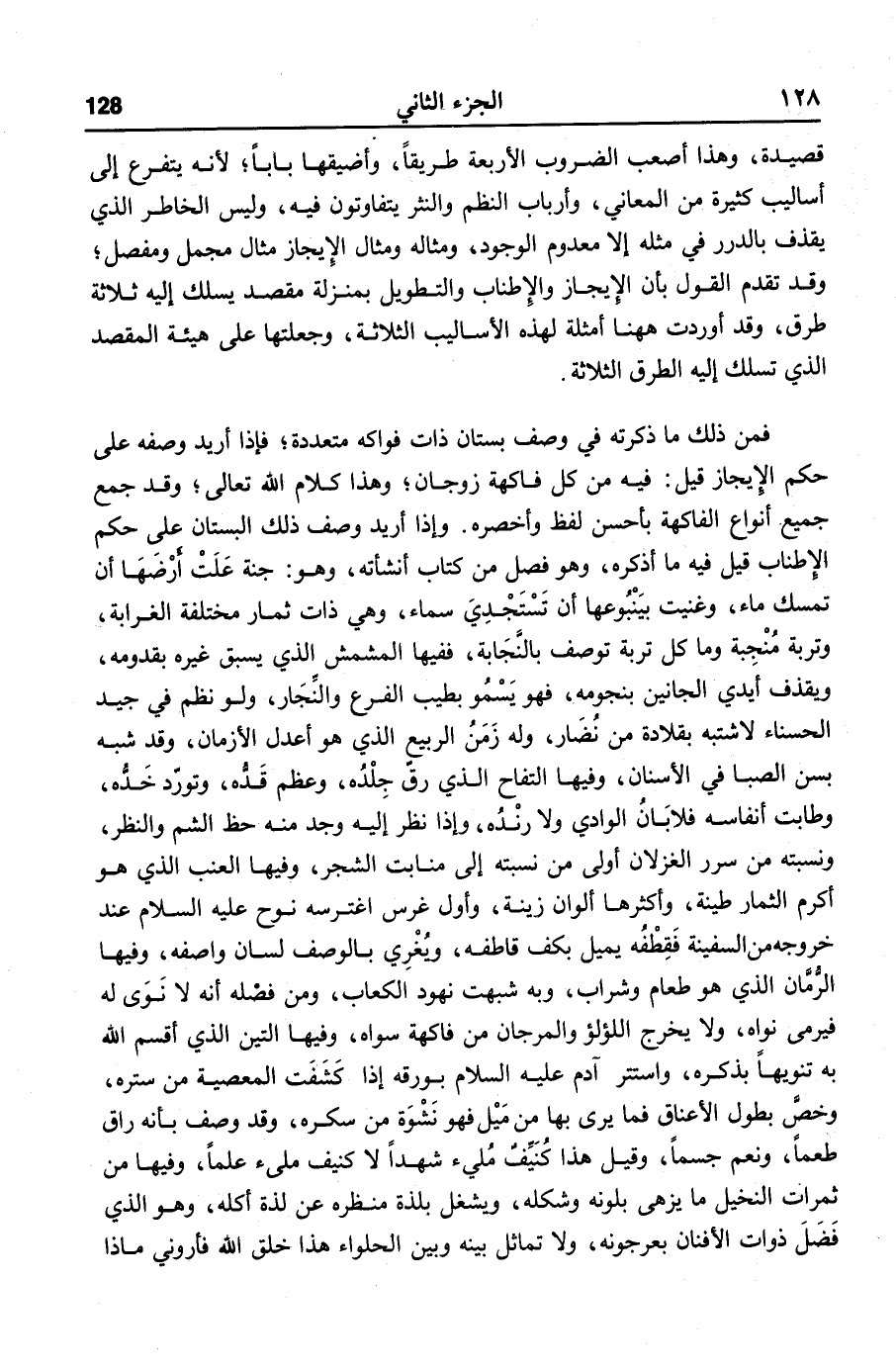 فمن ذلك ما ذكرته في وصف بستان ذات فواكه متعددة؛ فإذا أريد وصفه على حكم الإيجاز قيل: فيه من كل فاكهة زوجان؛ وهذا كلام الله تعالى؛ وقد جمع جميع أنواع الفاكهة بأحسن لفظ وأخصره. وإذا أريد وصف ذلك البستان على حكم الإطناب قيل فيه ما أذكره، وهو فصل من كتاب أنشأته، وهو: جنة علت أرضها أن تمسك ماء، وغنيت بينبوعها أن تستجدي سماء، وهي ذات ثمار مختلفة الغرابة، وتربة منجبة وما كل تربة توصف بالنّجابة، ففيها المشمش الذي يسبق غيره بقدومه، ويقذف أيدي الجانين بنجومه، فهو يسمو بطيب الفرع والنّجار، ولو نظم في جيد الحسناء لاشتبه بقلادة من نضار، وله زمن الربيع الذي هو أعدل الأزمان، وقد شبه بسن الصبا في الأسنان، وفيها التفاح الذي رقّ جلده، وعظم قدّه، وتورّد خدّه، وطابت أنفاسه فلابان الوادي ولا رنده، وإذا نظر إليه وجد منه حظ الشم والنظر، ونسبته من سرر الغزلان أولى من نسبته إلى منابت الشجر، وفيها العنب الذي هو أكرم الثمار طينة، وأكثرها ألوان زينة، وأول غرس اغترسه نوح عليه السلام عند خروجه من السفينة فقطفه يميل بكف قاطفه، ويغري بالوصف لسان واصفه، وفيها الرّمّان الذي هو طعام وشراب، وبه شبهت نهود الكعاب، ومن فضله أنه لا نوى له فيرمى نواه، ولا يخرج اللؤلؤ والمرجان من فاكهة سواه، وفيها التين الذي أقسم الله به تنويها بذكره، واستتر آدم عليه السلام بورقه إذا كشفت المعصية من ستره، وخصّ بطول الأعناق فما يرى بها من ميل فهو نشوة من سكره، وقد وصف بأنه راق طعما، ونعم جسما، وقيل هذا كنيّف مليء شهدا لا كنيف ملىء علما، وفيها من ثمرات النخيل ما يزهى بلونه وشكله، ويشغل بلذة منظره عن لذة أكله، وهو الذي فضل ذوات الأفنان بعرجونه، ولا تماثل بينه وبين الحلواء هذا خلق الله فأروني ماذا