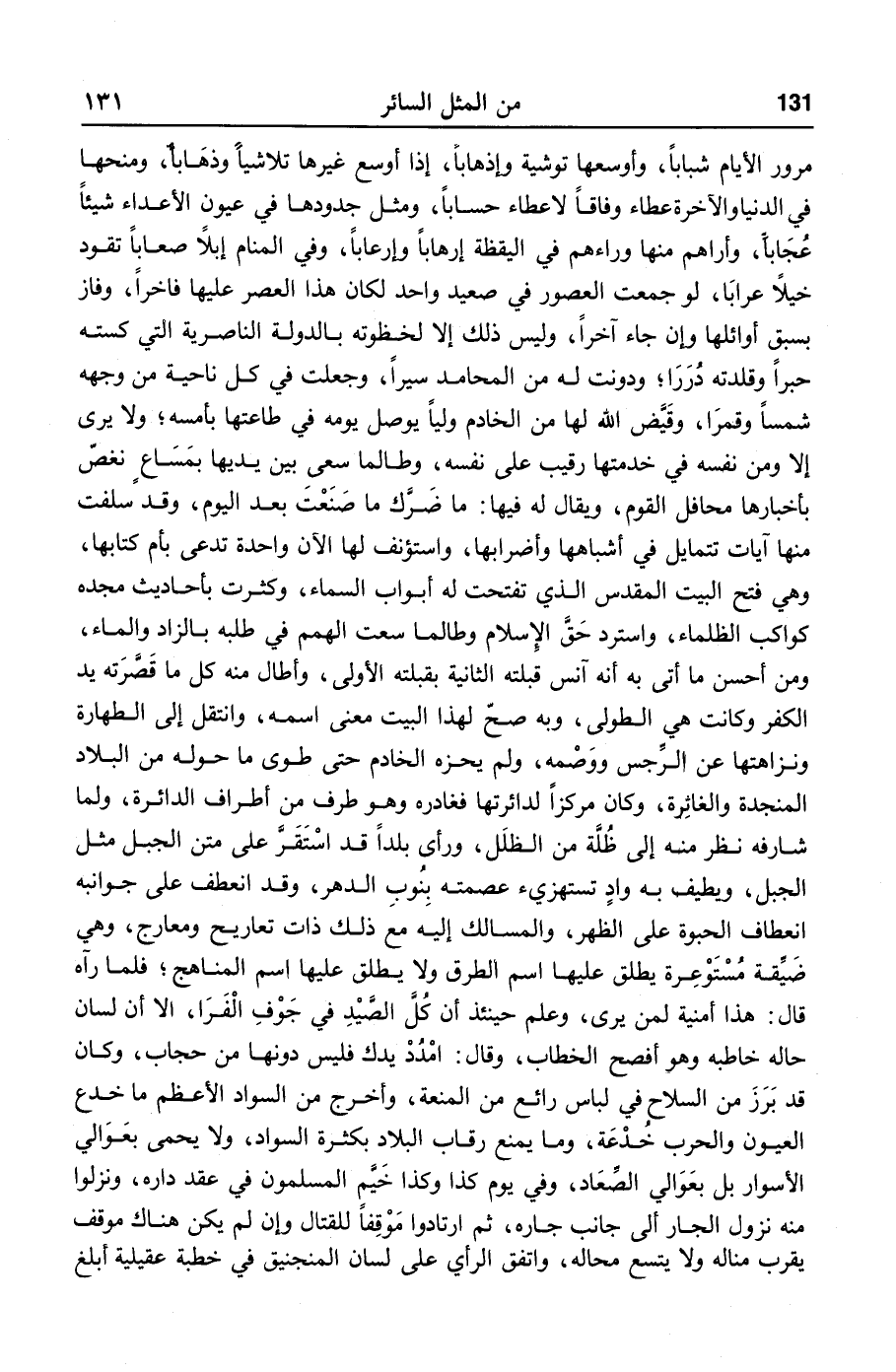 مرور الأيام شبابا، وأوسعها توشية وإذهابا، إذا أوسع غيرها تلاشيا وذهابا، ومنحها في الدنيا والآخرة عطاء وفاقا لاعطاء حسابا، ومثل جدودها في عيون الأعداء شيئا عجابا، وأراهم منها وراءهم في اليقظة إرهابا وإرعابا، وفي المنام إبلا صعابا تقود خيلا عرابا، لو جمعت العصور في صعيد واحد لكان هذا العصر عليها فاخرا، وفاز بسبق أوائلها وإن جاء آخرا، وليس ذلك إلا لخظوته بالدولة الناصرية التي كسته حبرا وقلدته دررا؛ ودونت له من المحامد سيرا، وجعلت في كل ناحية من وجهه شمسا وقمرا، وقيّض الله لها من الخادم وليا يوصل يومه في طاعتها بأمسه؛ ولا يرى إلا ومن نفسه في خدمتها رقيب على نفسه، وطالما سعى بين يديها بمساع نغصّ بأخبارها محافل القوم، ويقال له فيها: ما ضرّك ما صنعت بعد اليوم، وقد سلفت منها آيات تتمايل في أشباهها وأضرابها، واستؤنف لها الآن واحدة تدعى بأم كتابها، وهي فتح البيت المقدس الذي تفتحت له أبواب السماء، وكثرت بأحاديث مجده كواكب الظلماء، واسترد حقّ الإسلام وطالما سعت الهمم في طلبه بالزاد والماء، ومن أحسن ما أتى به أنه آنس قبلته الثانية بقبلته الأولى، وأطال منه كل ما قصّرته يد الكفر وكانت هي الطولى، وبه صحّ لهذا البيت معنى اسمه، وانتقل إلى الطهارة ونزاهتها عن الرّجس ووصمه، ولم يحزه الخادم حنى طوى ما حوله من البلاد المنجدة والغاثرة، وكان مركزا لدائرتها فغادره وهو طرف من أطراف الدائرة، ولما شارفه نظر منه إلى ظلّة من الظلل، ورأى بلدا قد استقرّ على متن الجبل مثل الجبل، ويطيف به واد تستهزيء عصمته بنوب الدهر، وقد انعطف على جوانبه انعطاف الحبوة على الظهر، والمسالك إليه مع ذلك ذات تعاريح ومعارج، وهي ضيّقة مستوعرة يطلق عليها اسم الطرق ولا يطلق عليها اسم المناهج؛ فلما رآه قال: هذا أمنية لمن يرى، وعلم حينئذ أن كلّ الصّيد في جوف الفرا، الا أن لسان حاله خاطبه وهو أفصح الخطاب، وقال: امدد يدك فليس دونها من حجاب، وكان قد برز من السلاح في لباس رائع من المنعة، وأخرج من السواد الأعظم ما خدع العيون والحرب خدعة، وما يمنع رقاب البلاد بكثرة السواد، ولا يحمى بعوالي الأسوار بل بعوالي الصّعاد، وفي يوم كذا وكذا خيّم المسلمون في عقد داره، ونزلوا منه نزول الجار ألى جانب جاره، ثم ارتادوا موقفا للقتال وإن لم يكن هناك موقف يقرب مناله ولا يتسع محاله، واتفق الرأي على لسان المنجنيق في خطبة عقيلية أبلغ