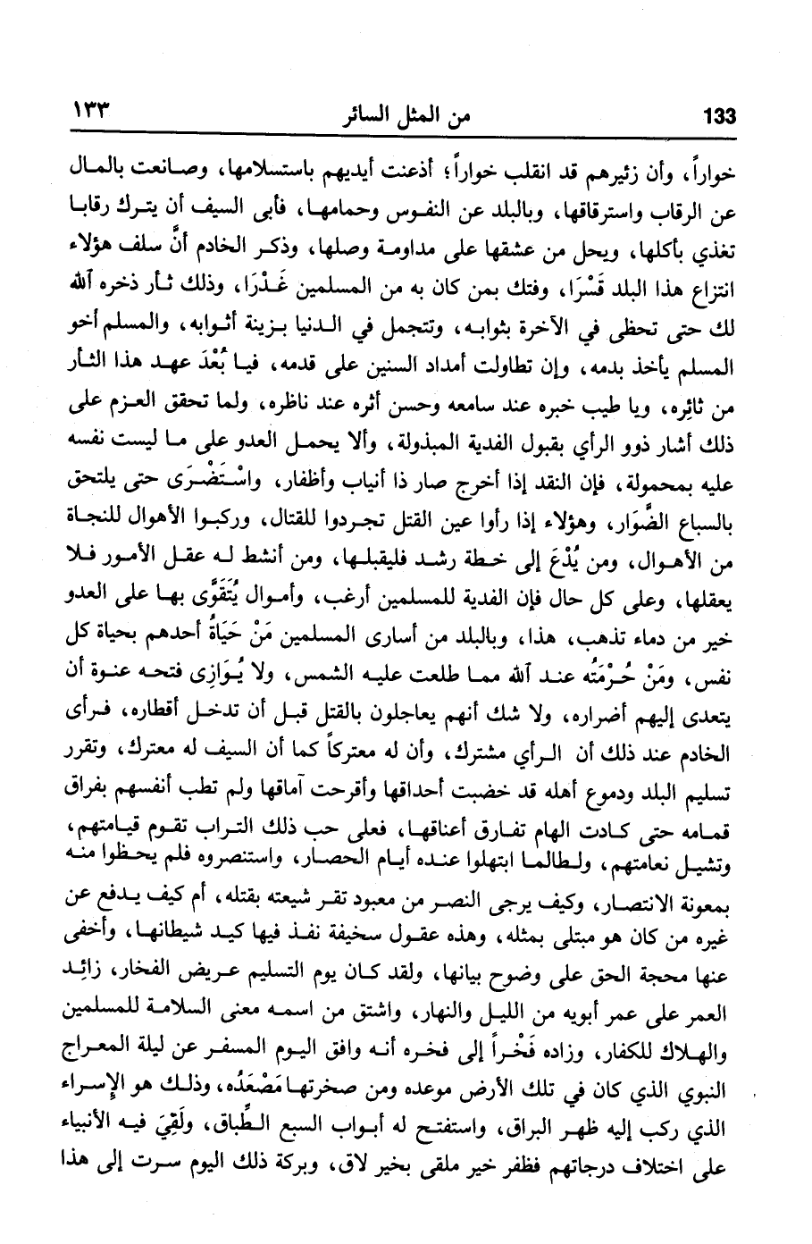 خوارا، وأن زئيرهم قد انقلب خوارا؛ أذعنت أيديهم باستسلامها، وصانعت بالمال عن الرقاب واسترقاقها، وبالبلد عن النفوس وحمامها، فأبى السيف أن يترك رقابا تغذي بأكلها، ويحل من عشقها على مداومة وصلها، وذكر الخادم أنّ سلف هؤلاء انتزاع هذا البلد قسرا، وفتك بمن كان به من المسلمين غدرا، وذلك ثأر ذخره الله لك حتى تحظى في الآخرة بثوابه، وتتجمل في الدنيا بزينة أثوابه، والمسلم أخو المسلم يأخذ بدمه، وإن تطاولت أمداد السنين على قدمه، فيا بعد عهد هذا الثأر من ثائره، ويا طيب خبره عند سامعه وحسن أثره عند ناظره، ولما تحقق العزم على ذلك أشار ذوو الرأي بقبول الفدية المبذولة، وألا يحمل العدو على ما ليست نفسه عليه بمحمولة، فإن النقد إذا أخرج صار ذا أنياب وأظفار، واستضرى حتى يلتحق بالسباع الضّوار، وهؤلاء إذا رأوا عين القتل تجردوا للقتال، وركبوا الأهوال للنجاة من الأهوال، ومن يدع إلى خطة رشد فليقبلها، ومن أنشط له عقل الأمور فلا يعقلها، وعلى كل حال فإن الفدية للمسلمين أرغب، وأموال يتقوّى بها على العدو خير من دماء تذهب، هذا، وبالبلد من أسارى المسلمين من حياة أحدهم بحياة كل نفس، ومن حرمته عند الله مما طلعت عليه الشمس، ولا يوازى فتحه عنوة أن يتعدى إليهم أضراره، ولا شك أنهم يعاجلون بالقتل قبل أن تدخل أقطاره، فرأى الخادم عند ذلك أن الرأي مشترك، وأن له معتركا كما أن السيف له معترك، وتقرر تسليم البلد ودموع أهله قد خضبت أحداقها وأقرحت آماقها ولم تطب أنفسهم بفراق قمامه حتى كادت الهام تفارق أعناقها، فعلى حب ذلك التراب تقوم قيامتهم، وتشيل نعامتهم، ولطالما ابتهلوا عنده أيام الحصار، واستنصروه فلم يحظوا منه بمعونة الانتصار، وكيف يرجى النصر من معبود تقر شيعته بقتله، أم كيف يدفع عن غيره من كان هو مبتلى بمثله، وهذه عقول سخيفة نفذ فيها كيد شيطانها، وأخفى عنها محجة الحق على وضوح بيانها، ولقد كان يوم التسليم عريض الفخار، زائد العمر على عمر أبويه من الليل والنهار، واشتق من اسمه معنى السلامة للمسلمين والهلاك للكفار، وزاده فخرا إلى فخره أنه وافق اليوم المسفر عن ليلة المعراج النبوي الذي كان في تلك الأرض موعده ومن صخرتها مصعده، وذلك هو الإسراء الذي ركب إليه ظهر البراق، واستفتح له أبواب السبع الطّباق، ولقي فيه الأنبياء على اختلاف درجاتهم فظفر خير ملقى بخير لاق، وبركة ذلك اليوم سرت إلى هذا