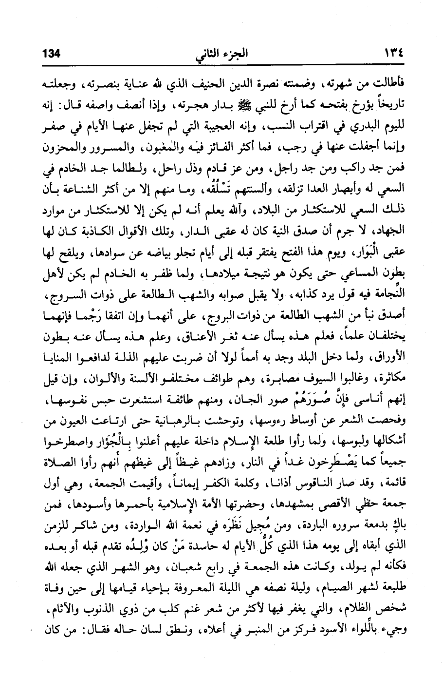 فأطالت من شهرته، وضمنته نصرة الدين الحنيف الذي لله عناية بنصرته، وجعلته تاريخا بؤرخ بفتحه كما أرخ للنبي صلّى الله عليه وسلّم بدار هجرته، وإذا أنصف واصفه قال: إنه لليوم البدري في اقتراب النسب، وإنه العجيبة التي لم تجفل عنها الأيام في صفر وإنما أجفلت عنها في رجب، فما أكثر الفائز فيه والمغبون، والمسرور والمحزون فمن جد راكب ومن جد راجل، ومن عز قادم وذل راحل، ولطالما جد الخادم في السعي له وأبصار العدا تزلقه، وألسنتهم تسلقه، وما منهم إلا من أكثر الشناعة بأن ذلك السعي للاستكثار من البلاد، والله يعلم أنه لم يكن إلا للاستكثار من موارد الجهاد، لا جرم أن صدق النية كان له عقبى الدار، وتلك الأقوال الكاذبة كان لها عقبى البوار، ويوم هذا الفتح يفتقر قبله إلى أيام تجلو بياضه عن سوادها، ويلقح لها بطون المساعي حتى يكون هو نتيجة ميلادها، ولما ظفر به الخادم لم يكن لأهل النّجامة فيه قول يرد كذابه، ولا يقبل صوابه والشهب الطالعة على ذوات السروج، أصدق نبأ من الشهب الطالعة من ذوات البروج، على أنهما وإن اتفقا رجما فإنهما يختلفان علما، فعلم هذه يسأل عنه ثغر الأعناق، وعلم هذه يسأل عنه بطون الأوراق، ولما دخل البلد وجد به أمما لولا أن ضربت عليهم الذلة لدافعوا المنايا مكاثرة، وغالبوا السيوف مصابرة، وهم طوائف مختلفو الألسنة والألوان، وإن قيل إنهم أناسى فإنّ صورهم صور الجان، ومنهم طائفة استشعرت حبس نفوسها، وفحصت الشعر عن أوساط رءوسها، وتوحشت بالرهبانية حتى ارتاعت العيون من أشكالها ولبوسها، ولما رأوا طلعة الإسلام داخلة عليهم أعلنوا بالجؤار واصطرخوا جميعا كما يصطرخون غدا في النار، وزادهم غيظا إلى غيظهم أنهم رأوا الصلاة قائمة، وقد صار الناقوس أذانا، وكلمة الكفر إيمانا، وأقيمت الجمعة، وهي أول جمعة حظي الأقصى بمشهدها، وحضرتها الأمة الإسلامية بأحمرها وأسودها، فمن باك بدمعة سروره الباردة، ومن مجيل نظره في نعمة الله الواردة، ومن شاكر للزمن الذي أبقاه إلى يومه هذا الذي كلّ الأيام له حاسدة من كان ولده تقدم قبله أو بعده فكأنه لم يولد، وكانت هذه الجمعة في رابع شعبان، وهو الشهر الذي جعله الله طليعة لشهر الصيام، وليلة نصفه هي الليلة المعروفة بإحياء قيامها إلى حين وفاة شخص الظلام، والتي يغفر فيها لأكثر من شعر غنم كلب من ذوي الذنوب والآثام، وجيء بالّلواء الأسود فركز من المنبر في أعلاه، ونطق لسان حاله فقال: من كان