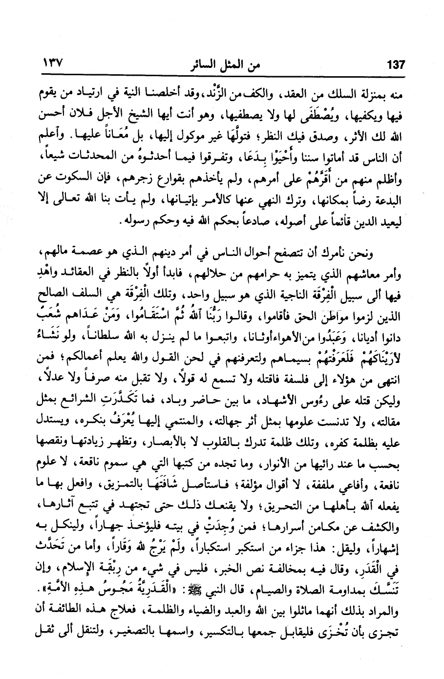 ونحن نأمرك أن تتصفح أحوال الناس في أمر دينهم الذي هو عصمة مالهم، وأمر معاشهم الذي يتميز به حرامهم من حلالهم، فابدأ أولا بالنظر في العقائد واهد فيها ألى سبيل الفرقة الناجية الذي هو سبيل واحد، وتلك الفرقة هي السلف الصالح الذين لزموا مواطن الحق فأقاموا، وقالوا ربّنا الله ثمّ استقاموا، ومن عداهم شعب دانوا أديانا، وعبدوا من الأهواء أوثانا، واتبعوا ما لم ينزل به الله سلطانا، ولو نشاء لأريناكهم فلعرفتهم بسيماهم ولتعرفنهم في لحن القول والله يعلم أعمالكم؛ فمن انتهى من هؤلاء إلى فلسفة فاقتله ولا تسمع له قولا، ولا تقبل منه صرفا ولا عدلا، وليكن قتله على رءوس الأشهاد، ما بين حاضر وباد، فما تكدّرت الشرائع بمثل مقالته، ولا تدنست علومها بمثل أثر جهالته، والمنتمي إليها يعرف بنكره، ويستدل عليه بظلمة كفره، وتلك ظلمة تدرك بالقلوب لا بالأبصار، وتظهر زيادتها ونقصها بحسب ما عند رائيها من الأنوار، وما تجده من كتبها التي هي سموم ناقعة، لا علوم نافعة، وأفاعي ملففة، لا أقوال مؤلفة؛ فاستأصل شافتها بالتمزيق، وافعل بها ما يفعله الله بأهلها من التحريق؛ ولا يقنعك ذلك حتى تجتهد في تتبع آثارها، والكشف عن مكامن أسرارها؛ فمن وجدت في بيته فليؤخذ جهارا، ولينكل به إشهارا، وليقل: هذا جزاء من استكبر استكبارا، ولم يرج لله وقارا، وأما من تحدّث في القدر، وقال فيه بمخالفة نص الخبر، فليس في شيء من ربقة الإسلام، وإن تنسّك بمداومة الصلاة والصيام، قال النبي صلّى الله عليه وسلّم: «القدريّة مجوس هذه الأمّة» .
