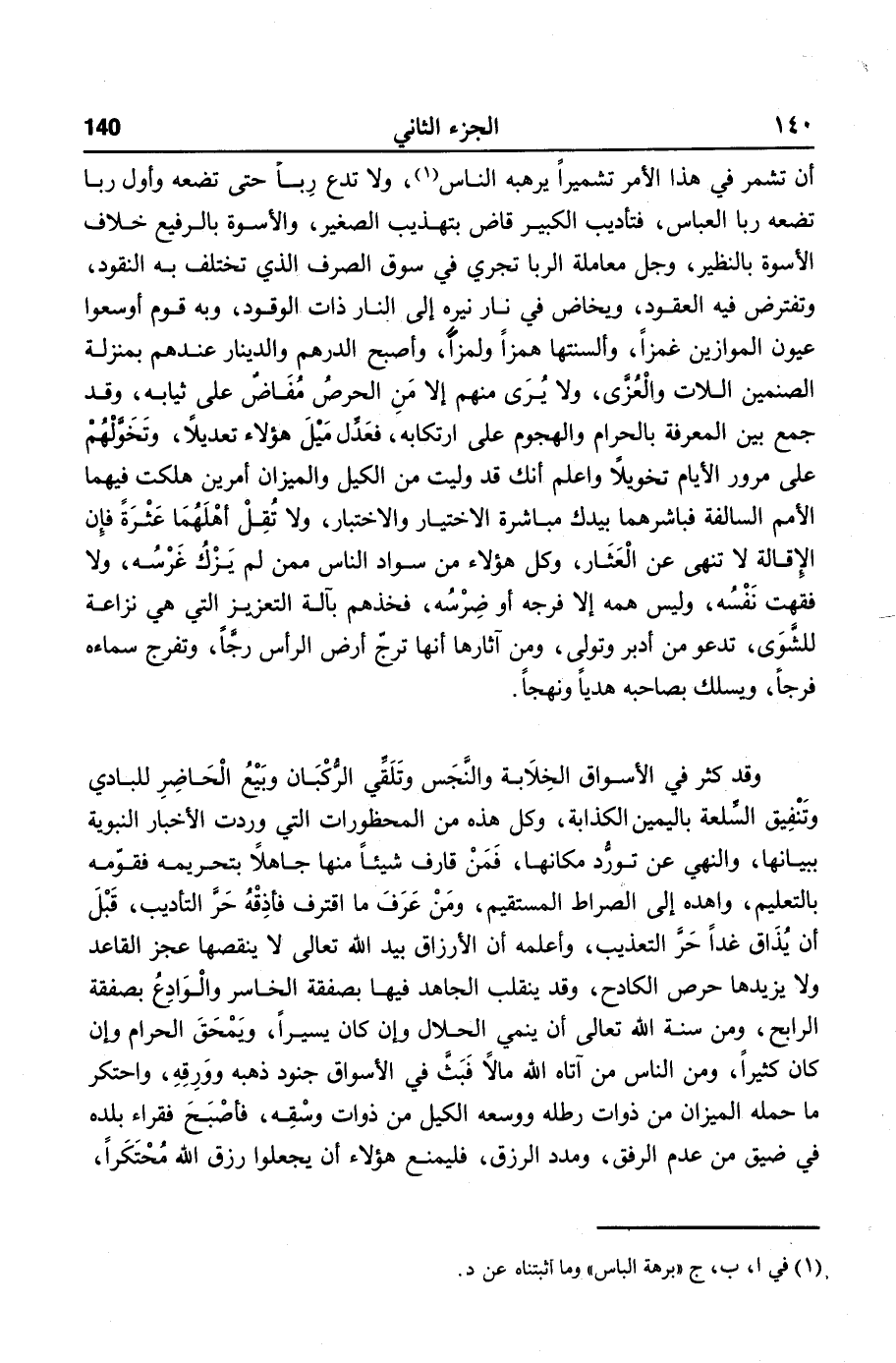وقد كثر في الأسواق الخلابة والنّجس وتلقّي الرّكبان وبيع الحاضر للبادي وتنفيق السّلعة باليمين الكذابة، وكل هذه من المحظورات التي وردت الأخبار النبوية ببيانها، والنهي عن تورّد مكانها، فمن قارف شيئا منها جاهلا بتحريمه فقوّمه بالتعليم، واهده إلى الصراط المستقيم، ومن عرف ما اقترف فأذقه حرّ التأديب، قبل أن يذاق غدا حرّ التعذيب، وأعلمه أن الأرزاق بيد الله تعالى لا ينقصها عجز القاعد ولا يزيدها حرص الكادح، وقد ينقلب الجاهد فيها بصفقة الخاسر والوادع بصفقة الرابح، ومن سنة الله تعالى أن ينمي الحلال وإن كان يسيرا، ويمحق الحرام وإن كان كثيرا، ومن الناس من آتاه الله مالا فبثّ في الأسواق جنود ذهبه وورقه، واحتكر ما حمله الميزان من ذوات رطله ووسعه الكيل من ذوات وسقه، فأصبح فقراء بلده في ضيق من عدم الرفق، ومدد الرزق، فليمنع هؤلاء أن يجعلوا رزق الله محتكرا،