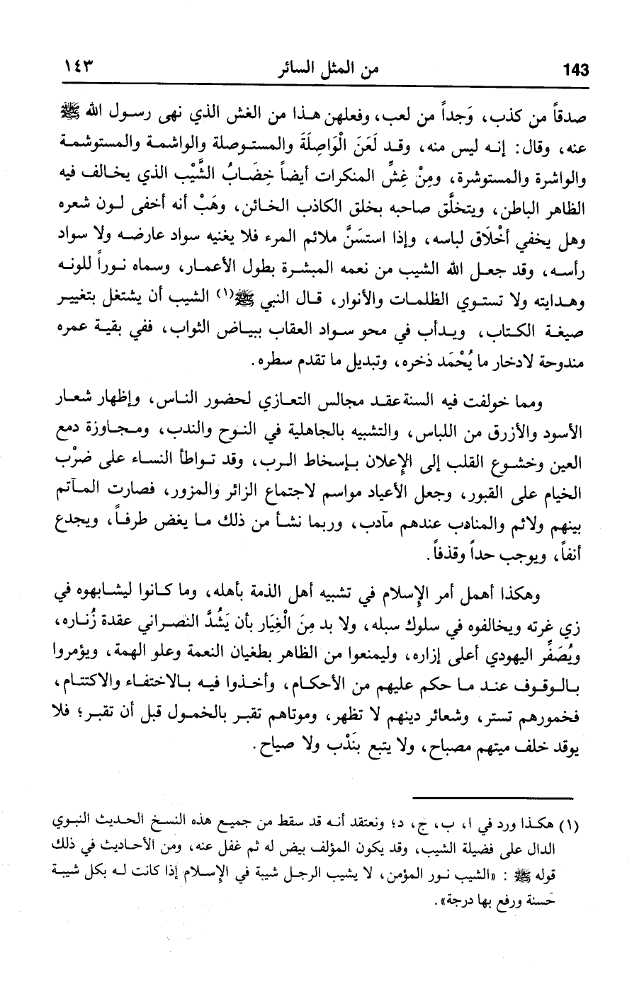 وهكذا أهمل أمر الإسلام في تشبيه أهل الذمة بأهله، وما كانوا ليشابهوه في زي غرته ويخالفوه في سلوك سبله، ولا بد من الغيار بأن يشدّ النصراني عقدة زناره، ويصفّر اليهودي أعلى إزاره، وليمنعوا من الظاهر بطغيان النعمة وعلو الهمة، ويؤمروا بالوقوف عند ما حكم عليهم من الأحكام، وأخذوا فيه بالاختفاء والاكتتام، فخمورهم تستر، وشعائر دينهم لا تظهر، وموتاهم تقبر بالخمول قبل أن تقبر؛ فلا يوقد خلف ميتهم مصباح، ولا يتبع بندب ولا صياح.