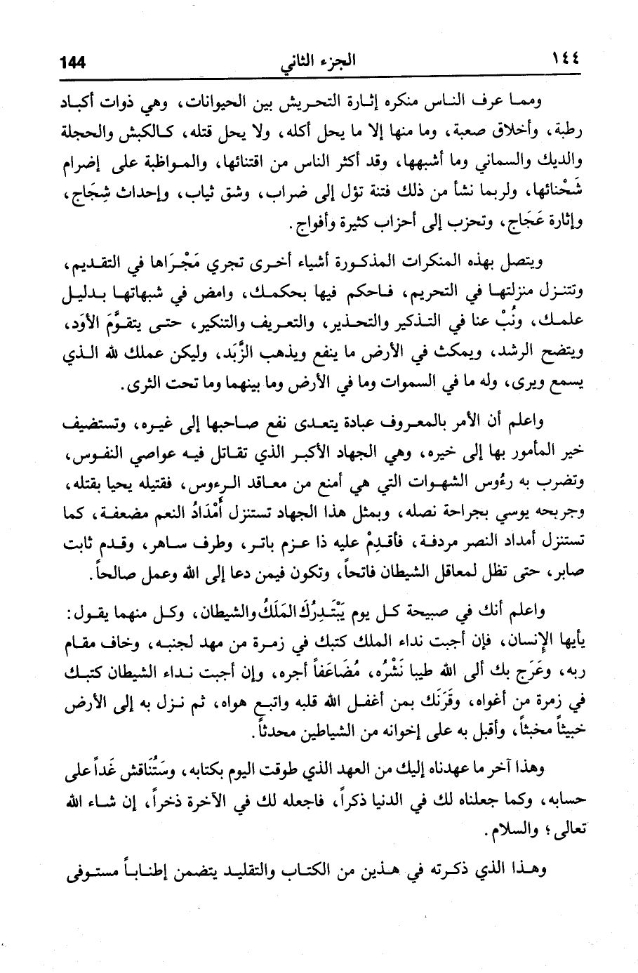 واعلم أن الأمر بالمعروف عبادة يتعدى نفع صاحبها إلى غيره، وتستضيف خير المأمور بها إلى خيره، وهي الجهاد الأكبر الذي تقاتل فيه عواصي النفوس، وتضرب به رءوس الشهوات التي هي أمنع من معاقد الرءوس، فقتيله يحيا بقتله، وجريحه يوسي بجراحة نصله، وبمثل هذا الجهاد تستنزل أمداد النعم مضعفة، كما تستنزل أمداد النصر مردفة، فأقدم عليه ذا عزم باتر، وطرف ساهر، وقدم ثابت صابر، حتى تظل لمعاقل الشيطان فاتحا، وتكون فيمن دعا إلى الله وعمل صالحا.