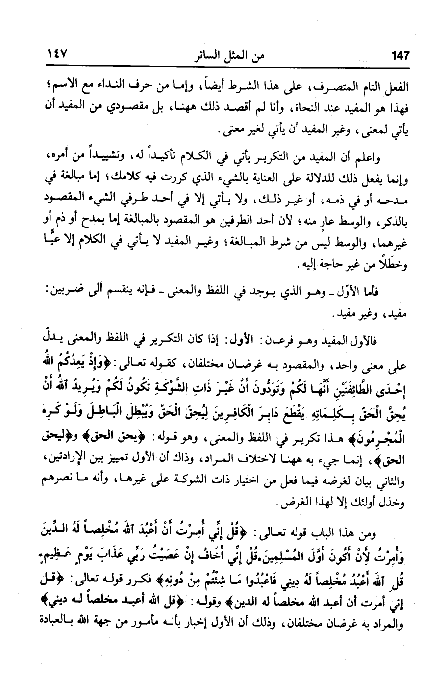 واعلم أن المفيد من التكرير يأتي في الكلام تأكيدا له، وتشييدا من أمره، وإنما يفعل ذلك للدلالة على العناية بالشيء الذي كررت فيه كلامك؛ إما مبالغة في مدحه أو في ذمه، أو غير ذلك، ولا يأتي إلا في أحد طرفي الشيء المقصود بالذكر، والوسط عار منه؛ لأن أحد الطرفين هو المقصود بالمبالغة إما بمدح أو ذم أو غيرهما، والوسط ليس من شرط المبالغة؛ وغير المفيد لا يأتي في الكلام إلا عيّا وخطلا من غير حاجة إليه.