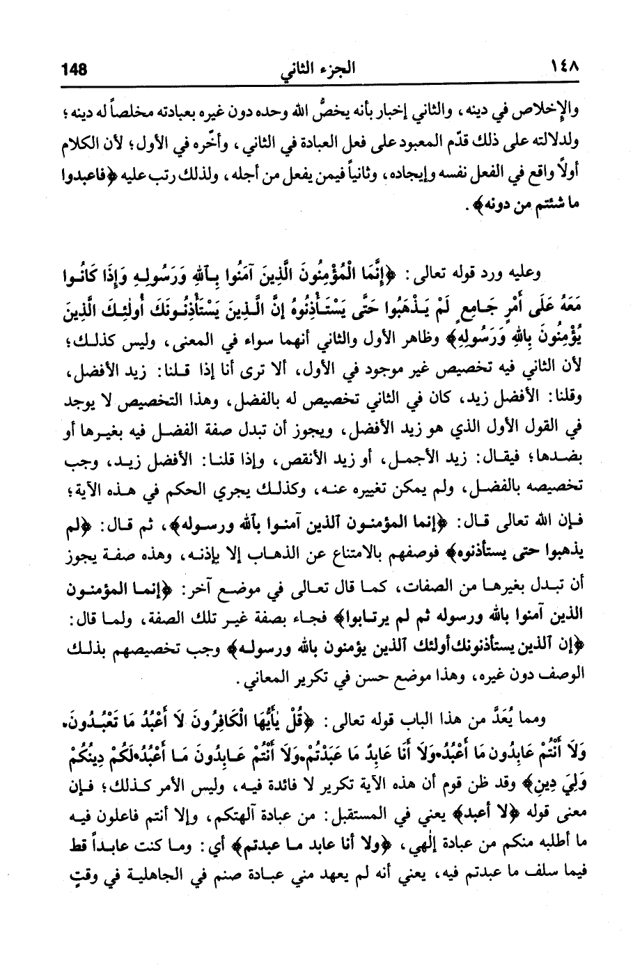 وظاهر الأول والثاني أنهما سواء في المعنى، وليس كذلك؛ لأن الثاني فيه تخصيص غير موجود في الأول، ألا ترى أنا إذا قلنا: زيد الأفضل، وقلنا: الأفضل زيد، كان في الثاني تخصيص له بالفضل، وهذا التخصيص لا يوجد في القول الأول الذي هو زيد الأفضل، ويجوز أن تبدل صفة الفضل فيه بغيرها أو بضدها؛ فيقال: زيد الأجمل، أو زيد الأنقص، وإذا قلنا: الأفضل زيد، وجب تخصيصه بالفضل، ولم يمكن تغييره عنه، وكذلك يجري الحكم في هذه الآية؛ فإن الله تعالى قال: إنما المؤمنون الذين آمنوا بالله ورسوله